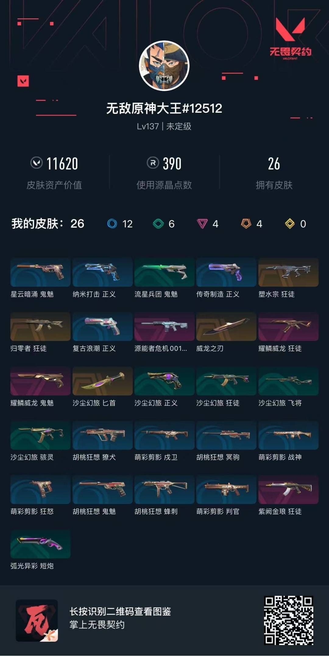 [12175869]4橙皮 4紫皮 26皮肤 27英雄 82卡面 390已用源晶 未定级 优质装备:耀鳞威龙套装,狂徒-归零者,狂徒-塑水宗,狂徒-紫阙金琅,狂徒-耀鳞威龙,威龙之刃,幻影-源能者危机001,鬼魅-耀鳞威龙 近战武器皮肤:匕首-沙尘幻旅