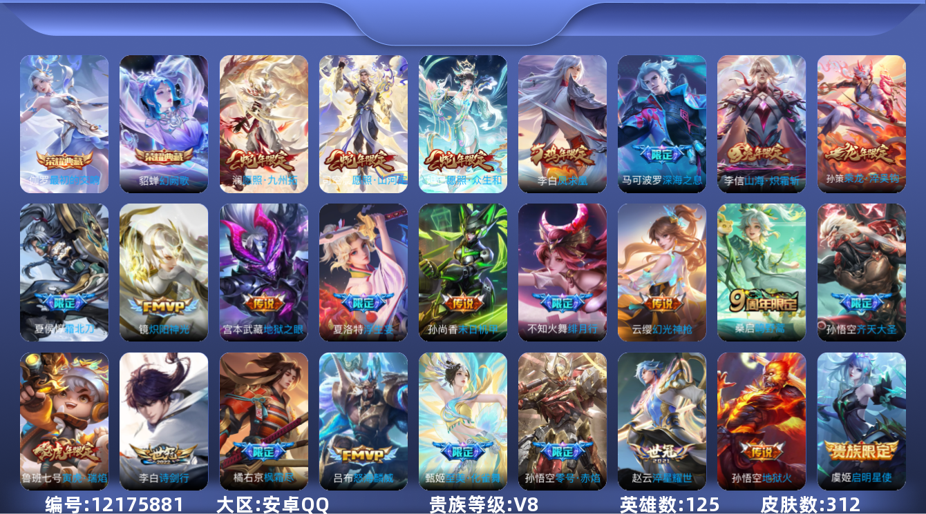 [12175881]V8 2典藏 25传说 125英雄 312皮肤 可修改实名 优质装备:幻阙歌(貂蝉典藏),最初的交响(伽罗典藏),炽阳神光,末日机甲-孙尚香(绿蚂蚱),地狱火,零号·赤焰,地狱之眼,淬星耀世,山海·炽霜斩(李信年限),浮生妄 传说皮:乘龙·淬吴钩(孙策年限),幻光神枪 珍宝阁皮:女武神,玩趣恶龙 限定皮:愿照·九州拓(澜年限),愿照·山河定(司空震年限),愿照·众生和(妲己年限),逐霄战戟,陌上桑,鸣野蒿,夏侯惇霜北刀,至尊宝,凤求凰(白切鸡),傲雪梅枪,绯月行,飞衡(韩信年限),至美·化雀舞,遇见飞天,诗剑行,齐天大圣,怒海麟威,降魔,游园惊梦,梁祝,御风骁将(吕布年限),烈魂,李小龙,霸王别姬-虞姬,孙行者,寅虎·瑞焰(虎皮蛋子),深海之息(深海大菠萝),枫霜尽 史诗皮:鸭鸭历险记-刘禅,器灵·浮梦炉,化蝶舞,星界战将,谪仙醉月,龙之律动,石田雨龙,撼地雄心,破空之剑,战舞者,芈月浮光幕影,琥珀纪元伽罗,百相守梦-百里守约,紫霞仙子,苍穹之光,黄金分割率,特工魅影,千年之狐,永昼,江河有灵,匿光侦查者,真我赫兹(百里守约),魅语,百解令(蒙犽),冰冠公主,青蛇,偶像歌手,白蛇,晚萤,暗夜猫娘,末日机甲-吕布,猫狗日记-孙策,乱世虎臣,节奏热浪,修罗,女仆咖啡,摇滚巨星,水果甜心,绅士熊喵,天才门将,星夜王子,心灵骇客,功夫厨神,德古拉伯爵,暗隐猎兽者,幽灵船长,鬼剑武藏,心灵战警,乐园奇幻夜,天秀·启明,舞动绿茵,地狱岩魂,纤云弄巧,繁星吟游(呼啦呼啦),拒霜思,缤纷独角兽,乘风破浪,逐浪之夏,月团寄思,水晶猎龙者,曙光守护者,金属风暴,原初追逐者,圣诞狂欢,圣诞恋歌,鹰眼统帅,暗夜贵公子,魅力维加斯,黎明之约,未来纪元-赵云