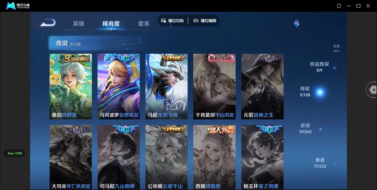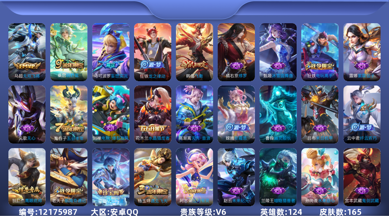 - [11524189]V6 8传说 124英雄 214皮肤 可修改实名 优质装备:猫影幻舞,炽阳神光,李逍遥,无双飞将,记忆之芯(机甲兔),澜逐花归海 珍宝阁皮:胡桃夹子,优雅恋人 限定皮:愿照·九州拓(澜年限),遇见飞天,诗剑行,五谷丰年,游园惊梦,李小龙,山海·玄木吟(马可年限) 史诗皮:器灵·浮梦炉,化蝶舞,龙之律动,战舞者,紫霞仙子,特工魅影,蒙恬荣光圣徽,晚萤,猫狗日记-孙策,乱世虎臣,修罗,摇滚巨星,水果甜心,绅士熊喵,天才门将,星夜王子,暗隐猎兽者,鬼剑武藏,地狱岩魂,纤云弄巧,繁星吟游(呼啦呼啦),乘风破浪,水晶猎龙者,金属风暴,原初追逐者,圣诞恋歌,鹰眼统帅,魅力维加斯,黎明之约,赏金猎手,滕王阁序,无心