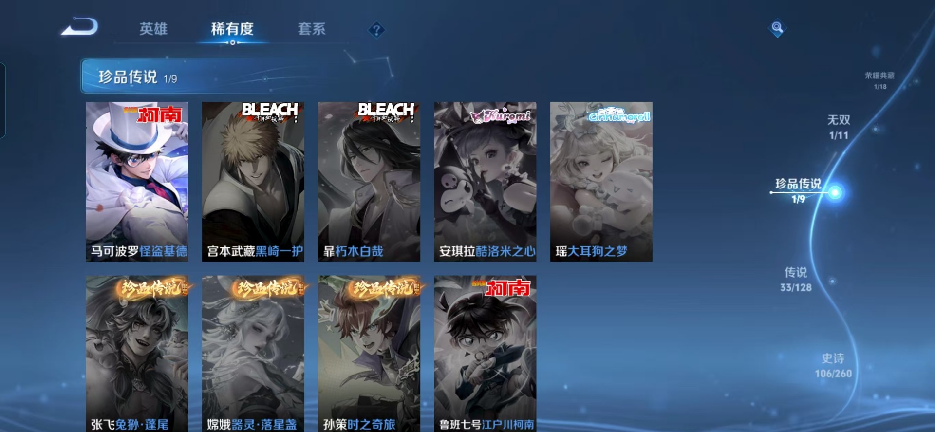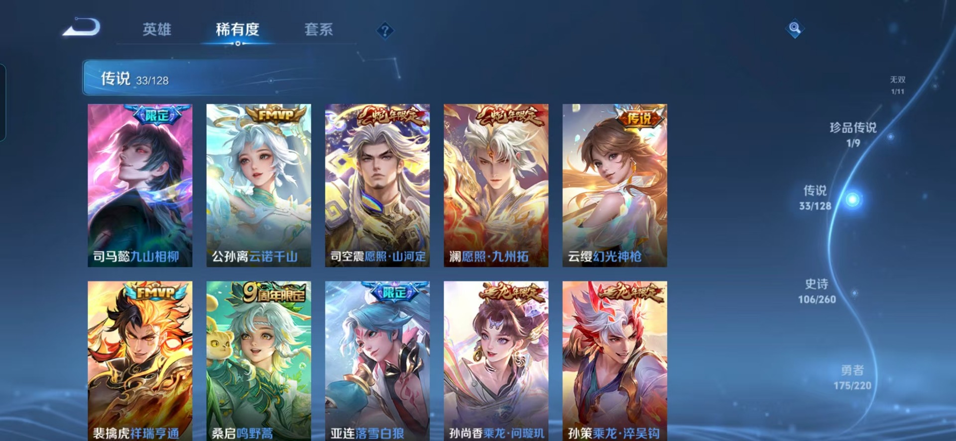 - [11632853]V9 1典藏 2珍品传说 23传说 126英雄 340皮肤 典藏英雄武则天 可修改实名 荣耀水晶:弑枪猎影(韩信典藏) 珍品传说:江户川柯南,时之奇旅-孙策 传说皮:铠冥王哈迪斯,幻光神枪,地狱火,仲夏夜之梦(大飞蛾),海洋之心,地狱之眼,一念神魔,云鹰飞将(小将军),无双飞将,乞巧织情,时之恋人-刘备(电焊工),超时空战士-狄仁杰 珍宝阁皮:妄想食味 限定皮:愿照·九州拓(澜年限),愿照·岁时盈(虞姬年限),愿照·山河定(司空震年限),愿照·众生和(妲己年限),愿照·千秋盛(女娲年限),逐霄战戟,陌上桑,鸣野蒿,夏侯惇霜北刀,至尊宝,白虎志(电光耗子),凤求凰(白切鸡),魔法小厨娘,飞衡(韩信年限),至美·乘鲤谣,天狼狩猎者,逐梦之星,岱宗(典韦年限),天狼溯光者,李小龙,辉光之辰,猪悟能,大圣娶亲,天魔缭乱,青春决赛季,冰霜恋舞曲,神奇女侠 史诗皮:星界战将,茶境仙,器灵·浮梦炉,龙之律动,石田雨龙,百相守梦-百里守约,百相守梦-黄忠,戍鼓铭心,东方月初,蒙犽顽岩魄,埋骨钱,海诺心动手记,百相守梦-周瑜,化蝶舞,破空之剑,紫霞仙子,苍穹之光,黄金分割率,特工魅影,千年之狐,永昼,冰冠公主,青蛇,偶像歌手,晚萤,魅语,末日机甲-吕布,猫狗日记-孙策,猫狗日记-大乔,时之恋人-孙尚香,乱世虎臣,节奏热浪,修罗,女仆咖啡,摇滚巨星,水果甜心,绅士熊喵,天才门将,星夜王子,心灵骇客,功夫厨神,德古拉伯爵,暗隐猎兽者,幽灵船长,鬼剑武藏,暗渊魔法,心灵战警,乐园奇幻夜,天秀·启明,舞动绿茵,地狱岩魂,纤云弄巧,缤纷独角兽,乘风破浪,逐浪之夏,水晶猎龙者,曙光守护者,箭羽风息,金属风暴,圣诞狂欢,圣诞恋歌,鹰眼统帅,暗夜贵公子,魅力维加斯,赏金猎手,未来纪元-赵云
