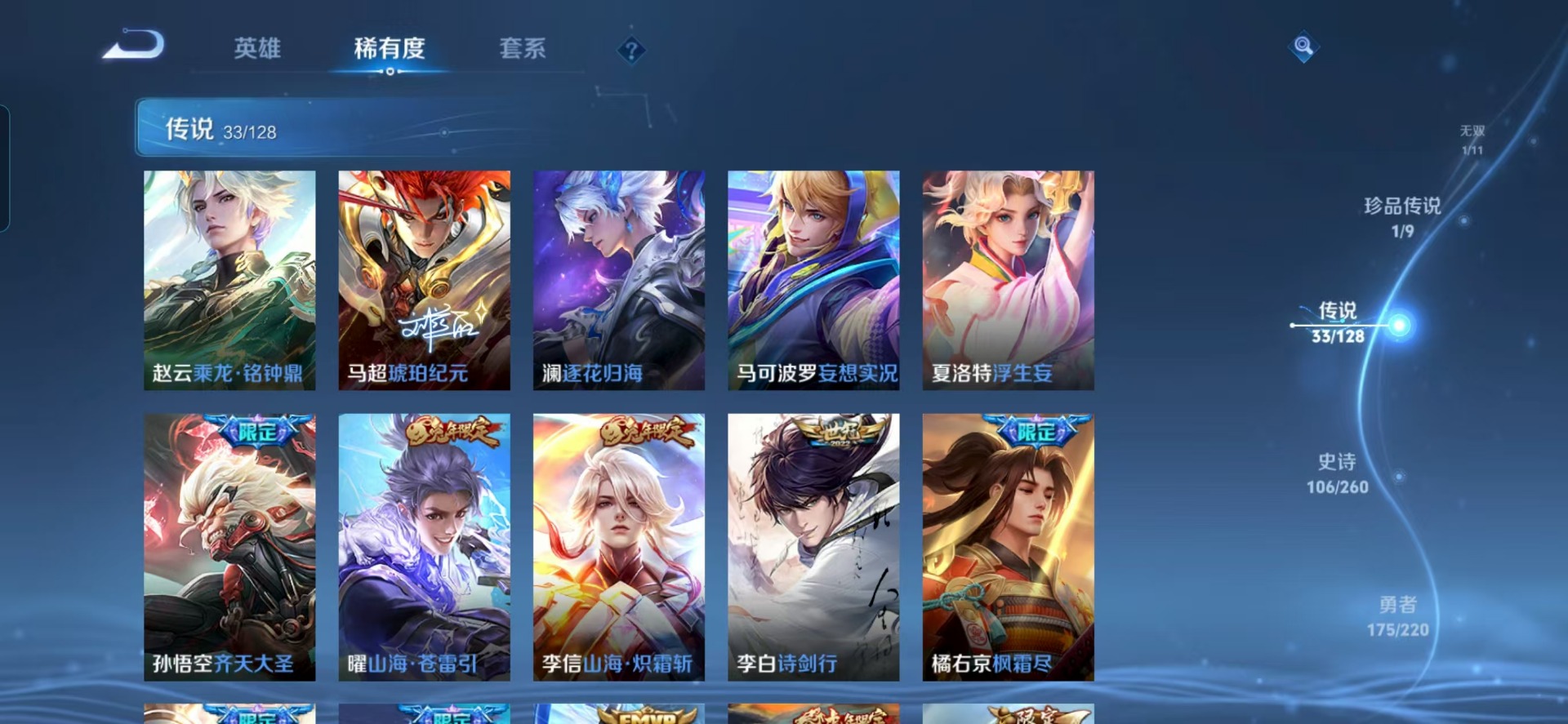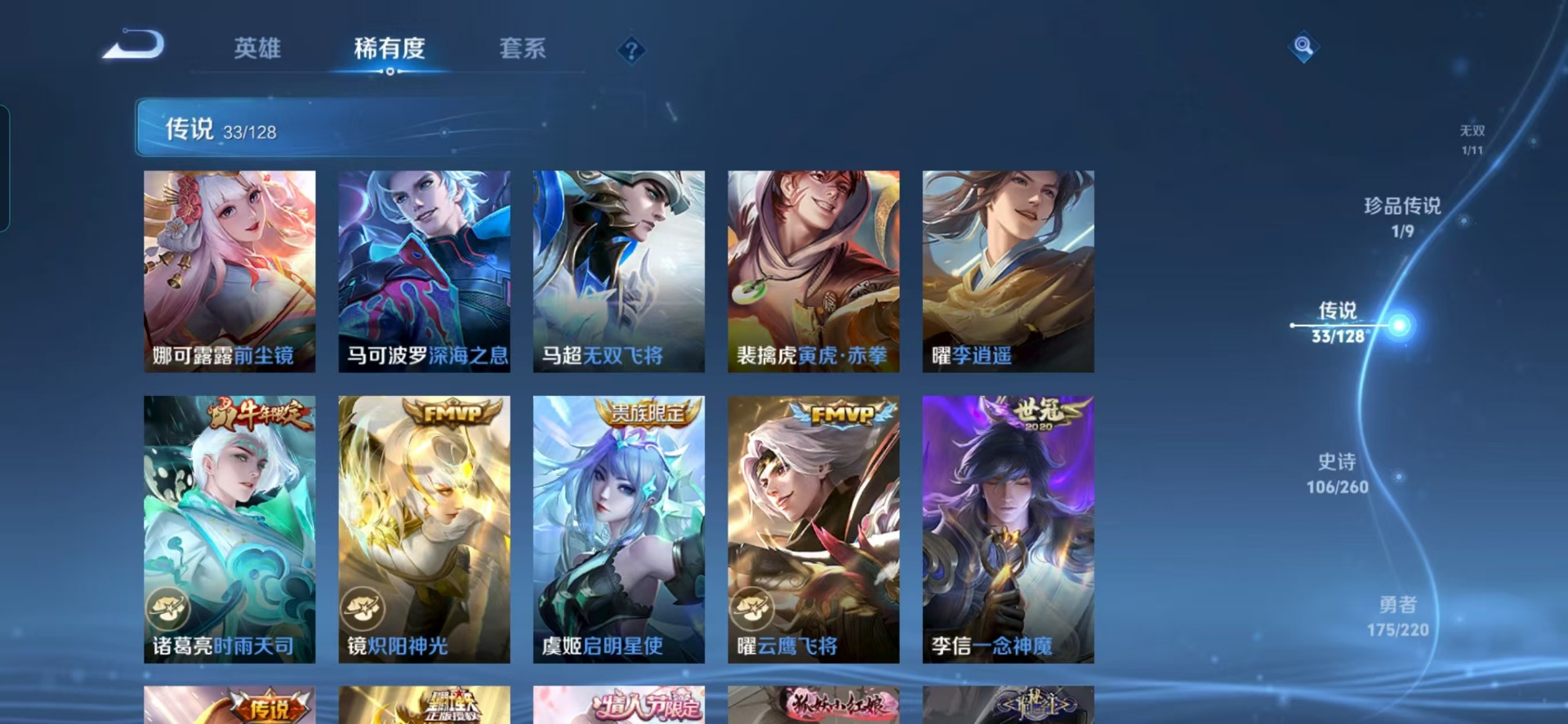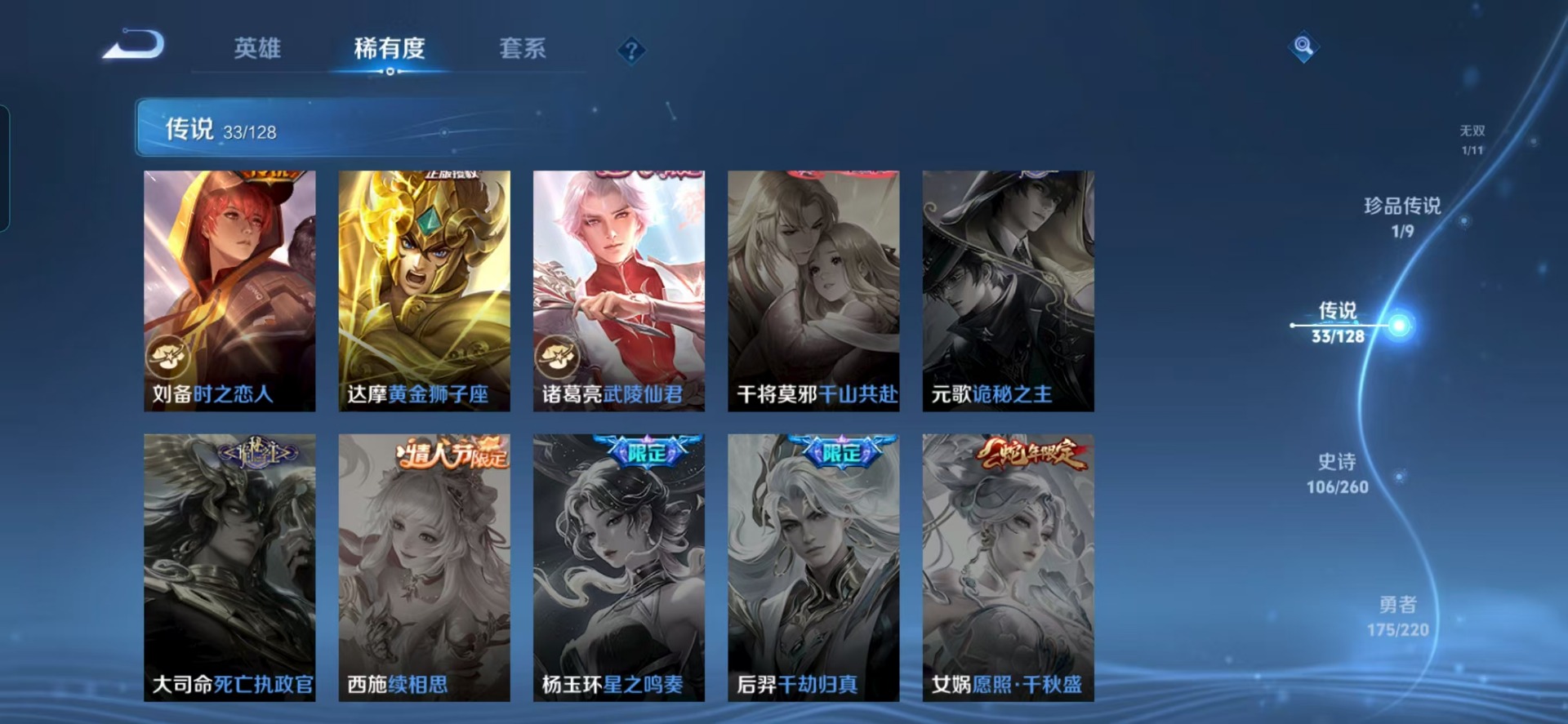 - PX_2099992-Q/绝世王者/282皮肤/125英雄/1典藏/0珍品无双/0无双/2珍品传说/22传说/100史诗/9稀有英雄 【2 珍品传说】怪盗基德 马可波罗,时之奇旅 孙策, 【1 典藏皮肤】弑枪猎影 韩信, 【22 传说皮肤】启明星使 虞姬,逐花归海 澜,齐天大圣 孙悟空,神器·狴犴令 狄仁杰,永曜之星 杨戬,诗剑行 李白,燃星之曲 花木兰,地狱之眼 宫本武藏,怒海麟威 吕布,时之恋