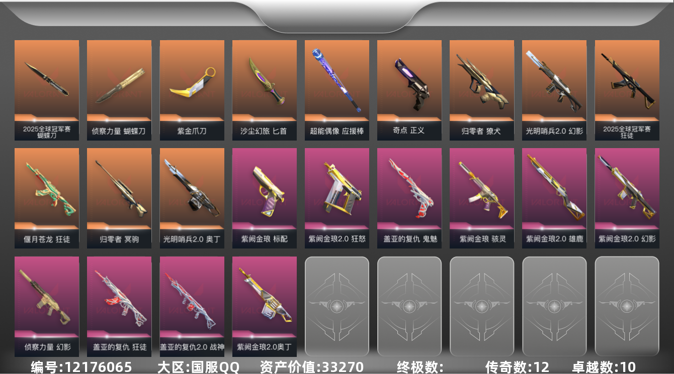 [12176065]12橙皮 10紫皮 60皮肤 27英雄 104卡面 910已用源晶 铂金 优质装备:紫阙金琅//2.0套装,2025全球冠军赛 蝴蝶刀,正义-奇点,冥驹-归零者,狂徒-盖亚的复仇,狂徒-偃月苍龙,幻影-侦察力量,獠犬-归零者,幻影-光明哨兵2.0,幻影-紫阙金琅2.0,标配-紫阙金琅,鬼魅-盖亚的复仇,蝴蝶刀-侦察力量,奥丁-光明哨兵2.0,奥丁-紫阙金琅2.0,紫金爪刀,骇灵-紫阙金琅,雄鹿-紫阙金琅2.0,2025全球冠军赛 狂徒 佩枪皮肤:狂怒-紫阙金琅2.0 机枪皮肤:战神-盖亚的复仇2.0 近战武器皮肤:匕首-沙尘幻旅,超能偶像 应援棒