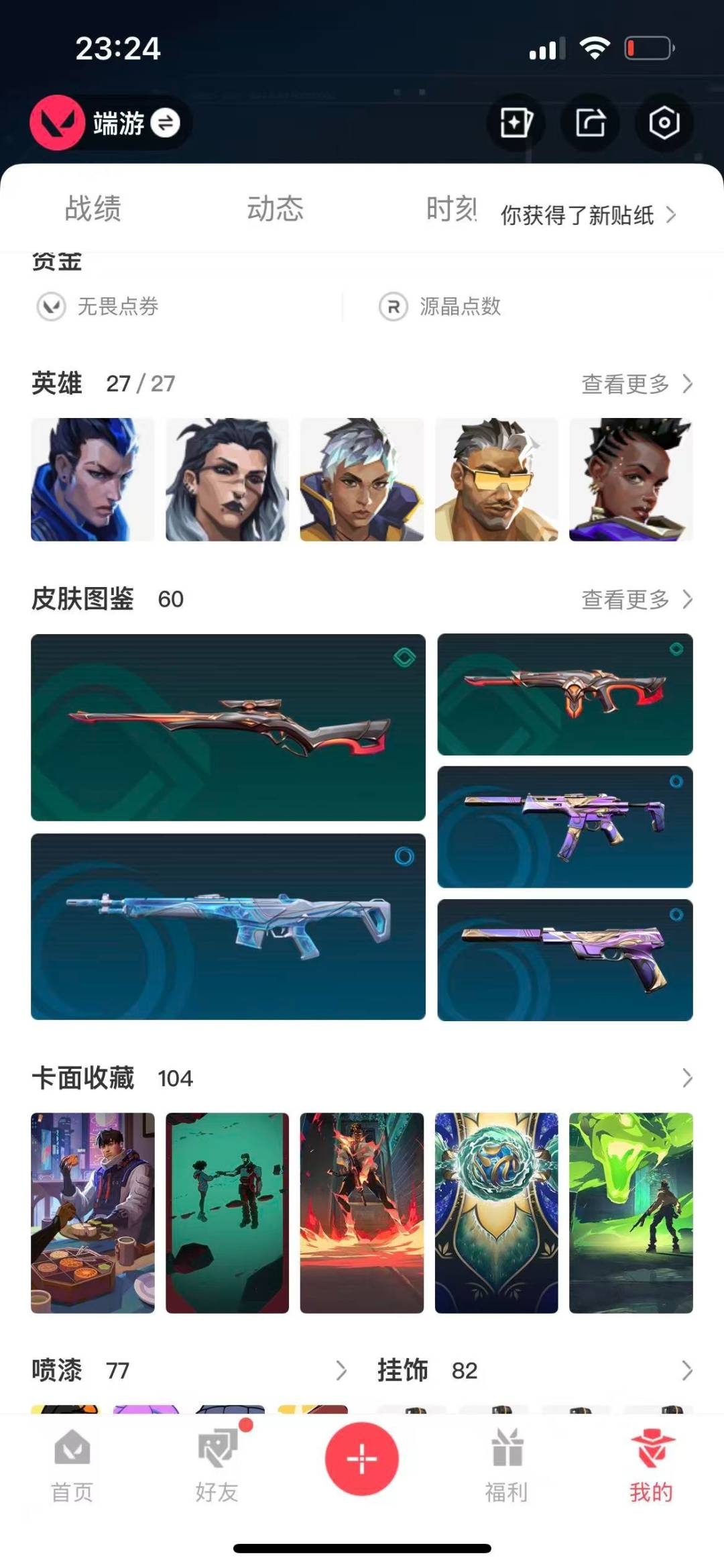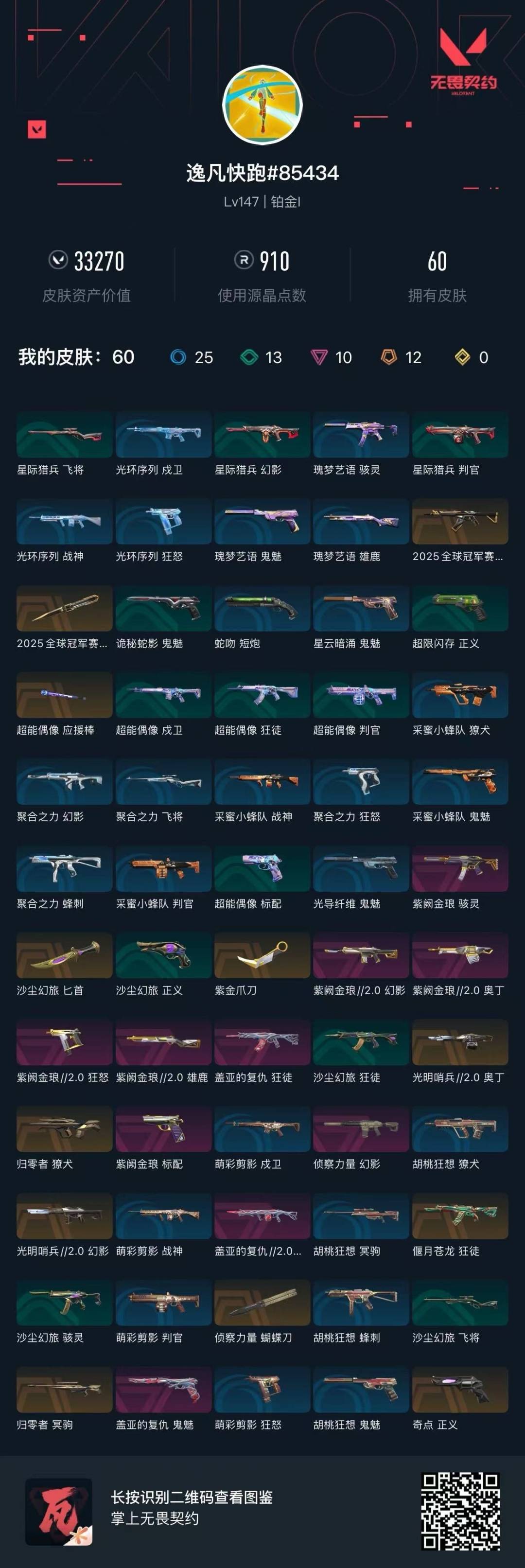 - [12224989]6橙皮 6紫皮 36皮肤 17英雄 63卡面 415已用源晶 未定级 优质装备:狂徒-紫阙金琅,幻影-侦察力量,鬼魅-天界神兵,紫金爪刀,狂徒-耀鳞威龙,神圣领域 战刀,VCT 2025 爪刀,诡秘蛇影,戍卫-海洋之星 套装:VCT 2025赛季礼包,VCTCN2025套装 佩枪皮肤:标配-VCT25xG2 步枪皮肤:狂徒-虚空遗器,狂徒-离子武器2.0