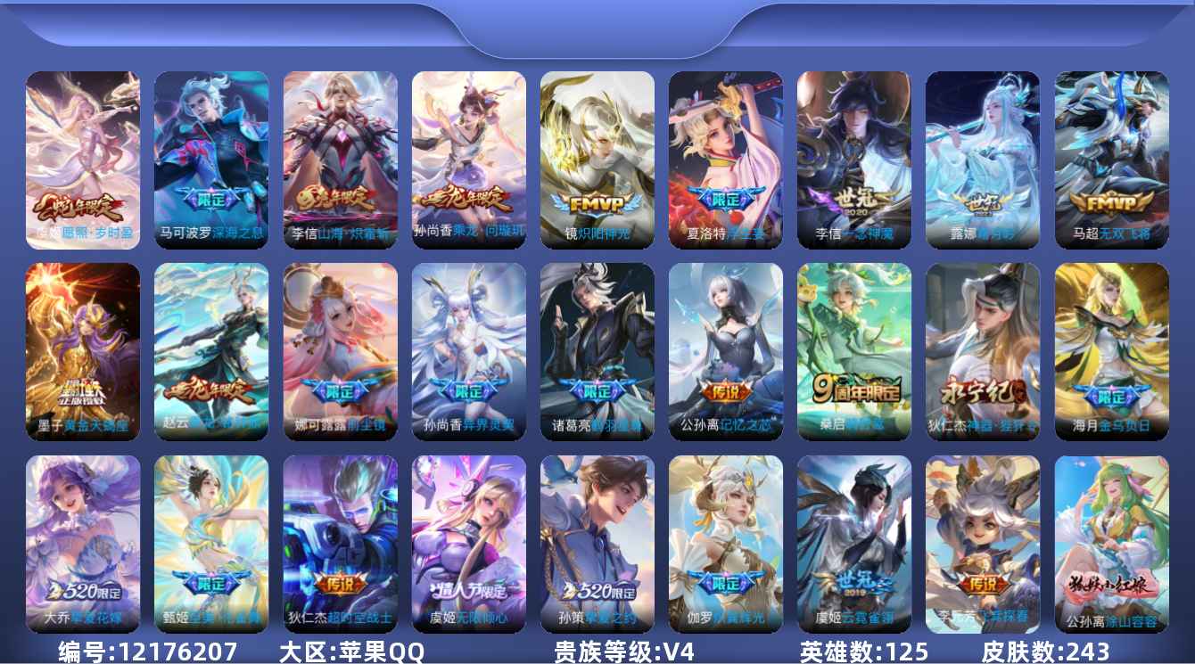 [12176207]V4 26传说 125英雄 243皮肤 可修改实名 优质装备:炽阳神光,一念神魔,云霓雀翎,飞鸢探春,超时空战士-狄仁杰,挚爱之约,挚爱花嫁,无双飞将,神器·狴犴令,山海·炽霜斩(李信年限),炽翼辉光(娃娃菜牛角包),浮生妄,记忆之芯(机甲兔),鹤羽星尊,霜月吟,金乌负日,黄金天蝎座,涂山容容 传说皮:乘龙·问璇玑(孙尚香年限),乘龙·铭钟鼎(赵云年限) 珍宝阁皮:万物之道,蔷薇恋人,女武神 限定皮:愿照·岁时盈(虞姬年限),鸣野蒿,异界灵契(白毛香),前尘镜,至美·化雀舞,遇见飞天,高山流水,无限倾心-虞姬,五谷丰年,梁祝,天狼溯光者,李小龙,朱雀志(守约年限),寅虎·心曲(虎婆),深海之息(深海大菠萝),山海·玄木吟(马可年限) 史诗皮:器灵·浮梦炉,狼魂孤将,化蝶舞,石田雨龙,琥珀纪元伽罗,星界特工,百相守梦-黄忠,紫霞仙子,永昼,江河有灵,高渐离燃音魔法,蒙恬荣光圣徽,冰冠公主,偶像歌手,电玩·爆裂旋风,暗夜猫娘,龙骑士(小龙虾),末日机甲-吕布,时之恋人-孙尚香,乱世虎臣,女仆咖啡,摇滚巨星,水果甜心,绅士熊喵,德古拉伯爵,暗隐猎兽者,幽灵船长,鬼剑武藏,舞动绿茵,地狱岩魂,缤纷独角兽,逐浪之夏,龙鼓争鸣,水晶猎龙者,金属风暴,圣诞恋歌,鹰眼统帅,魅力维加斯,黎明之约,赏金猎手,奇遇舞章,无心,玫瑰异探