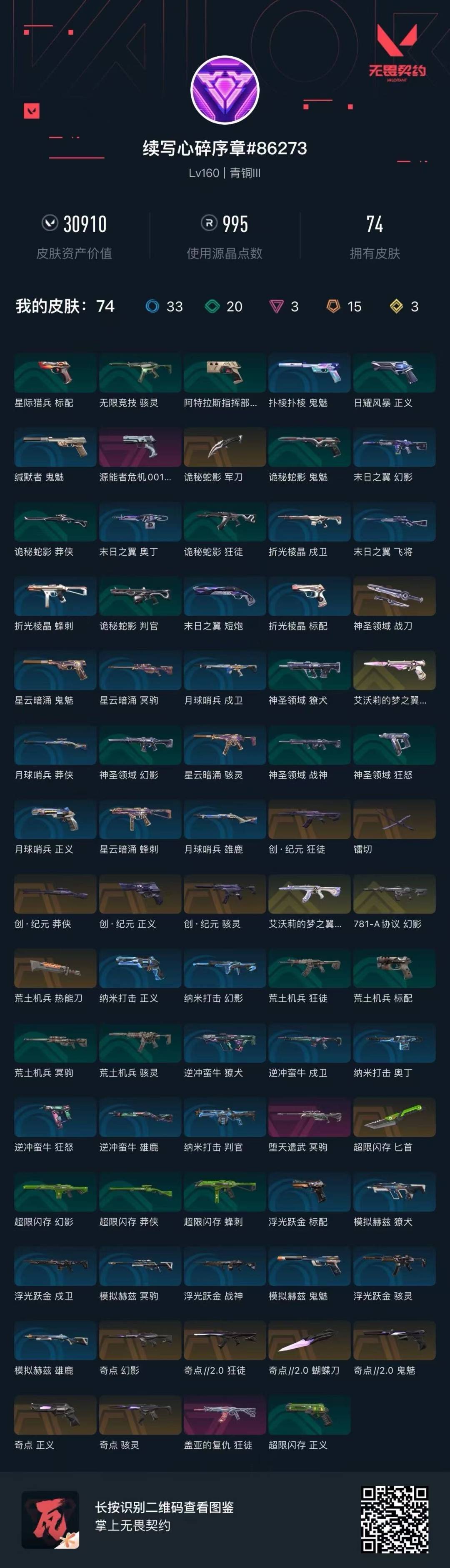 [12176251]15橙皮 3金皮 3紫皮 74皮肤 27英雄 100卡面 995已用源晶 青铜 优质装备:奇点//2.0套装,正义-奇点,幻影-781-A协议,狂徒-艾沃莉的梦之翼,幻影-奇点,狂徒-盖亚的复仇,冥驹-堕天遗武,狂徒-奇点//2.0,骇灵-奇点,鬼魅-艾沃莉的梦之翼,匕首-超限闪存,鬼魅-奇点//2.0,蝴蝶刀-奇点//2.0,荒土机兵热能刀,镭切,神圣领域 战刀,诡秘蛇影,标配-源能者危机001 套装:创·纪元套装 佩枪皮肤:正义-创·纪元 冲锋枪皮肤:骇灵-创·纪元 步枪皮肤:狂徒-创·纪元 狙击枪皮肤:莽侠-创·纪元
