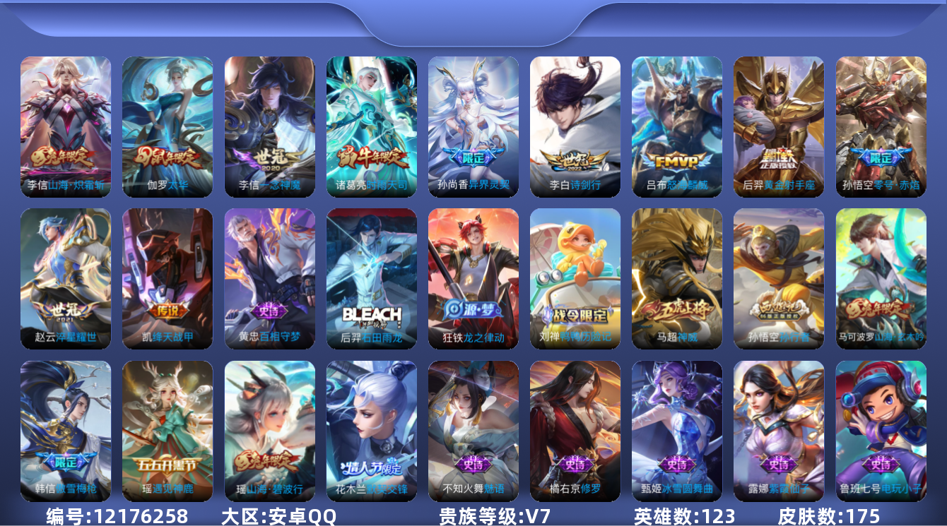 [12176258]V7 11传说 123英雄 175皮肤 可修改实名 优质装备:黄金射手座,绛天战甲(鸡嘴战神),一念神魔,零号·赤焰,淬星耀世,山海·炽霜斩(李信年限) 珍宝阁皮:万物之道,蔷薇恋人 限定皮:太华(伽罗年限),异界灵契(白毛香),傲雪梅枪,时雨天司(水龙头),神威(电光马子),山海·碧波行(瑶年限),遇见飞天,高山流水,诗剑行,怒海麟威,五谷丰年,天狼溯光者,李小龙,默契交锋-花木兰,孙行者,神器·万象笔,山海·玄木吟(马可年限) 史诗皮:鸭鸭历险记-刘禅,龙之律动,石田雨龙,百相守梦-黄忠,遇见神鹿,紫霞仙子,苍穹之光,电玩小子(小书包),白龙吟,黄金分割率,特工魅影,永昼,魅语,无限星赏官,青蛇,末日机甲-吕布,猫狗日记-孙策,乱世虎臣,节奏热浪,修罗,女仆咖啡,摇滚巨星,水果甜心,星夜王子,心灵骇客,时之奇旅-安琪拉,暗隐猎兽者,幽灵船长,鬼剑武藏,心灵战警,乐园奇幻夜,舞动绿茵,地狱岩魂,拒霜思,乘风破浪,箭羽风息,金属风暴,圣诞恋歌,鹰眼统帅,无心,未来纪元-赵云