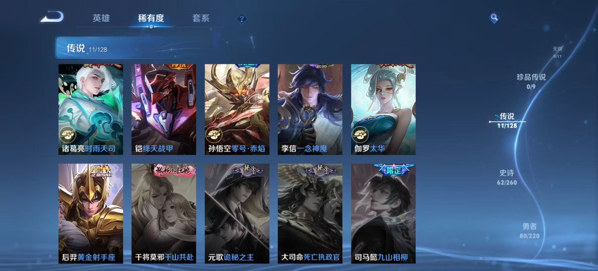 - [11762008]V7 3传说 109英雄 120皮肤 可修改实名 优质装备:云霓雀翎,仲夏夜之梦(大飞蛾) 珍宝阁皮:蔷薇恋人 限定皮:至尊宝,武陵仙君(小桃花),玄嵩(庄周年限),遇见飞天,高山流水,游园惊梦,梁祝,李小龙,辉光之辰,如梦令-后羿,霸王别姬-虞姬,奇迹圣诞,猪悟能,一生所爱,大圣娶亲,引擎之心,云端筑梦师 史诗皮:遇见神鹿,黄金分割率,青蛇,猫狗日记-大乔,水果甜心,心灵骇客,幽灵船长,舞动绿茵,纤云弄巧,繁星吟游(呼啦呼啦),缤纷独角兽,圣诞恋歌,鹰眼统帅,魅力维加斯