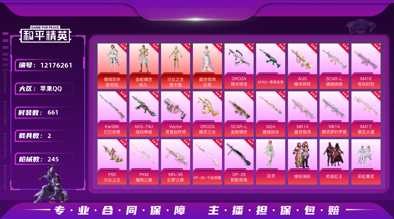 [12176261]4红装 35粉装 19特效枪 2载具 10印记 可二次 可修改实名 战神框 身法装备:8号机(新粉螳螂) 优质装备:沙丘之主-图卡盟(黄金木乃伊),一级沙丘之主-图卡盟(1级黄金木乃伊),镜域双华-欧若拉,四级镜域双华-欧若拉(4级欧若拉),金蛇镇世-烛九,盛世惊鸿-云鸾,一级金蛇镇世-烛九(1级烛九),一级盛世惊鸿-云鸾(1级云鸾),护世瑞兽,晶梦灵驹,缤纷油彩(猪妹猪脸妹),炙焰红王,Vector灵感创作师,M417第五大道,P90沙丘之主,SCAR-L-锦绣绵绵,M24镜域双华,PKM江南烟雨,M416电玩时刻,Mk14精灵梦叶罗丽,M762-青锋波束,时空协奏·心弦,GROZA-精灵之光,DP-28-千金淑猫,千金淑猫,牡丹亭·游园,GROZA-镜光银凌,AKS-74U-信仰神谕,信仰神谕,羲和光序,SCAR-L金蛇镇世,MK14-盛世惊鸿,MG-36-幻梦之森,晶梦幻蝶,AUG-暖羊咩咩,彩虹独角兽,月下星之子,智耀战神,绯穹魔姬,花灵,Kar98K-巳巳如意 热门装扮:飓风飞鹰,彩虹鹿灵,赤焰黑爵,冷魅冰骑,太空嘟嘟,第五大道,呆萌星弥,白勺歌姬,小可学妹,镜光幻境,繁龙极客,蜜语绒猫,绝色倾城,鎏金朋克,烟云彩露,严莉莉,美雪,美琪,脉冲星,冠军兔兔,守护天翼,金域紫灵 稀有枪皮:DP-28-豹影疾电 五级特效枪:五级M762-青锋波束,五级GROZA-镜光银凌,五级Kar98K-巳巳如意,五级AUG-暖羊咩咩,五级M416-电玩时刻,五级SCAR-L-锦绣绵绵 四级特效枪:四级AKS-74U-信仰神谕,四级Vector-灵感创作师 三级特效枪:三级GROZA-精灵之光,三级Mk14-精灵梦叶罗丽,三级SCAR-L金蛇镇世,三级MK14-盛世惊鸿,三级MG-36-幻梦之森,三级M417-第五大道,三级P90-沙丘之主,三级PKM-江南烟雨,三级M24-镜域双华 二级特效枪:二级DP-28-千金淑猫 一级特效枪:一级DP-28-豹影疾电 紫色装扮:极速光影,SS30特训套装,SS31特训套装,云朵鹅,彩虹兔,雪绒豹,乐游熊熊,SS33特训套装,旭日情侣,莱茵河畔,香榭午后,顶瓜瓜,决胜时刻,时希公主,S3赛事,S4赛事,电音精灵,软羊咩咩,魅力单车,黄色格斗者,黑色伏地魔,龟仙人,冰河战士,龙魂突击队,蝶变,香桃花海,霓虹街区,酷潮明星,软软马