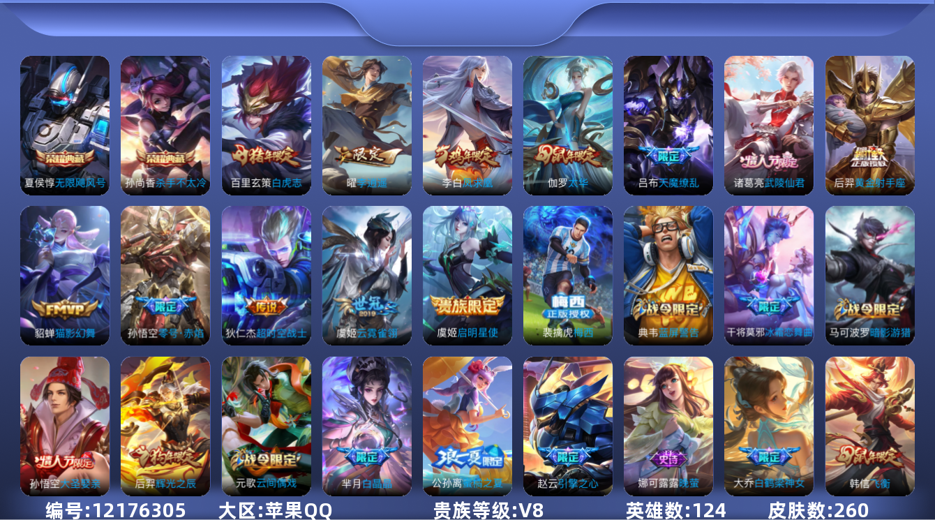 [12176305]V8 2典藏 12传说 124英雄 260皮肤 可修改实名 优质装备:无限飓风号(高达),杀手不太冷,黄金射手座,猫影幻舞,云霓雀翎,零号·赤焰,李逍遥,超时空战士-狄仁杰 珍宝阁皮:女武神 限定皮:白虎志(电光耗子),凤求凰(白切鸡),太华(伽罗年限),梅西,武陵仙君(小桃花),时之彼端,白鹤梁神女,魔法小厨娘,白晶晶,飞衡(韩信年限),遇见飞天,梁祝,逐梦之翼,李小龙,逐梦之光,辉光之辰,如梦令-后羿,大圣娶亲,引擎之心,天魔缭乱,冰霜恋舞曲,云端筑梦师,蜜橘之夏 史诗皮:苍穹之光,电玩小子(小书包),白龙吟,特工魅影,千年之狐,偶像歌手,晚萤,暗夜猫娘,龙骑士(小龙虾),末日机甲-吕布,女仆咖啡,摇滚巨星,水果甜心,绅士熊喵,天才门将,星夜王子,心灵骇客,功夫厨神,德古拉伯爵,暗隐猎兽者,幽灵船长,鬼剑武藏,心灵战警,舞动绿茵,地狱岩魂,纤云弄巧,繁星吟游(呼啦呼啦),缤纷独角兽,乘风破浪,逐浪之夏,曙光守护者,箭羽风息,金属风暴,原初追逐者,圣诞狂欢,圣诞恋歌,鹰眼统帅,暗夜贵公子,魅力维加斯,黎明之约,未来纪元-赵云