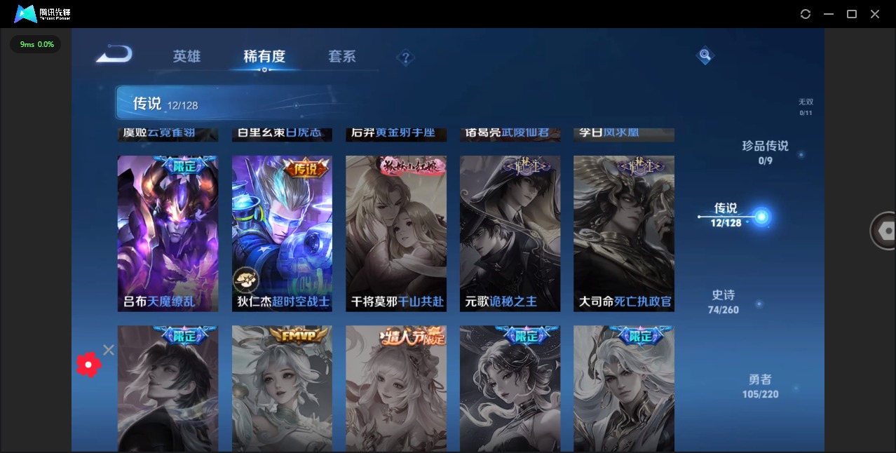 - PX_2057213-贵族等级: V5 英雄数: 47 皮肤数: 30 传说皮: 超时空战士-狄仁杰,云诺千山 限定皮: 鸣野蒿,愿照·山河定