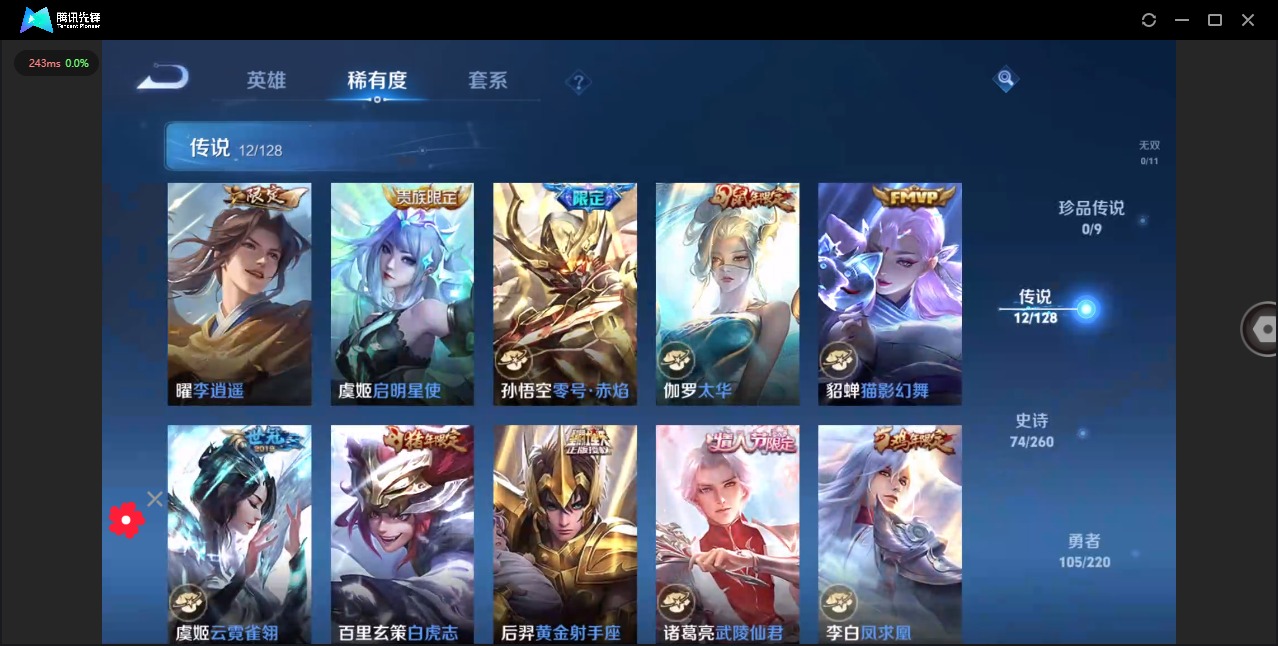 - [11605460]V5 1典藏 2传说 123英雄 121皮肤 可修改实名 女号 优质装备:幻阙歌(貂蝉典藏),地狱火 传说皮:幻光神枪 珍宝阁皮:女武神 限定皮:高山流水,五谷丰年,梁祝,李小龙,匿光追影者 史诗皮:龙之律动,藏狐·褐绒,石田雨龙,百相守梦-黄忠,黄金分割率,特工魅影,千年之狐,女仆咖啡,摇滚巨星,水果甜心,天才门将,星夜王子,暗隐猎兽者,鬼剑武藏,纤云弄巧,缤纷独角兽,逐浪之夏,水晶猎龙者,曙光守护者,金属风暴,圣诞恋歌,鹰眼统帅,暗夜贵公子,魅力维加斯,无心