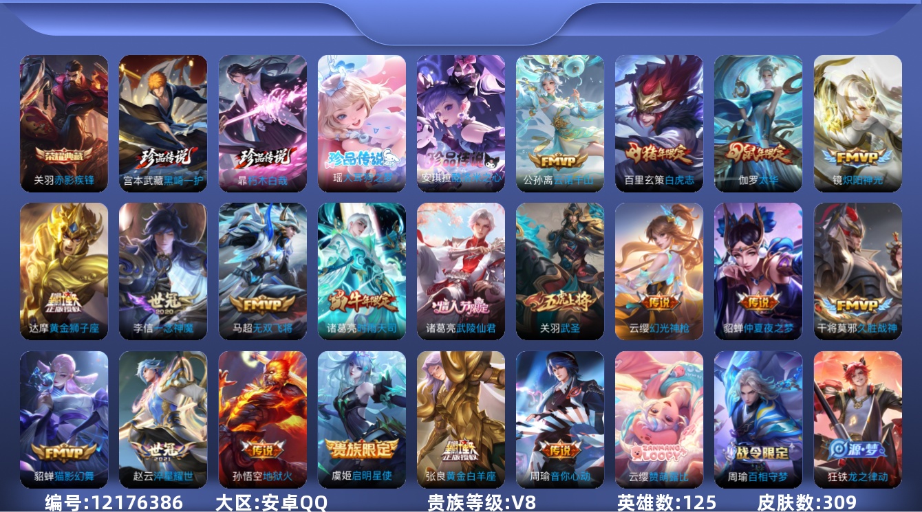 [12176386]【商品标题】:安卓Q-V8-最强王者段位-125英雄-306皮肤-1典藏-0珍品无双-0无双-4珍品传说-19传说-86史诗