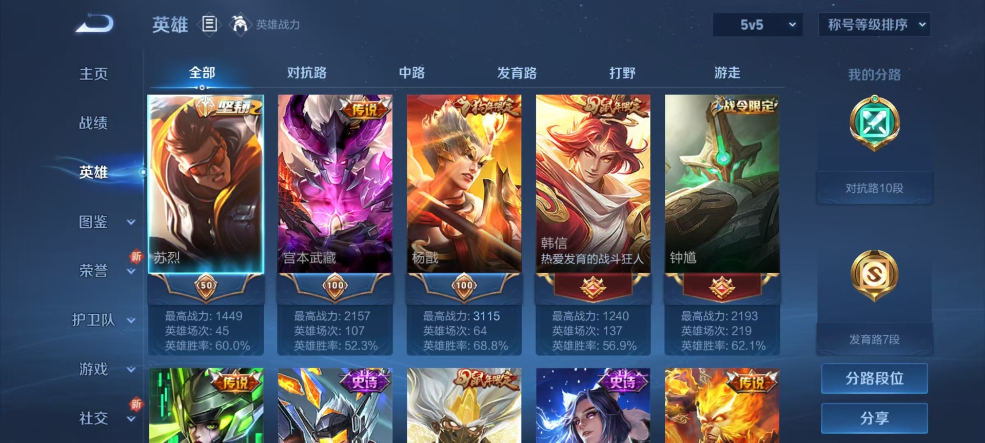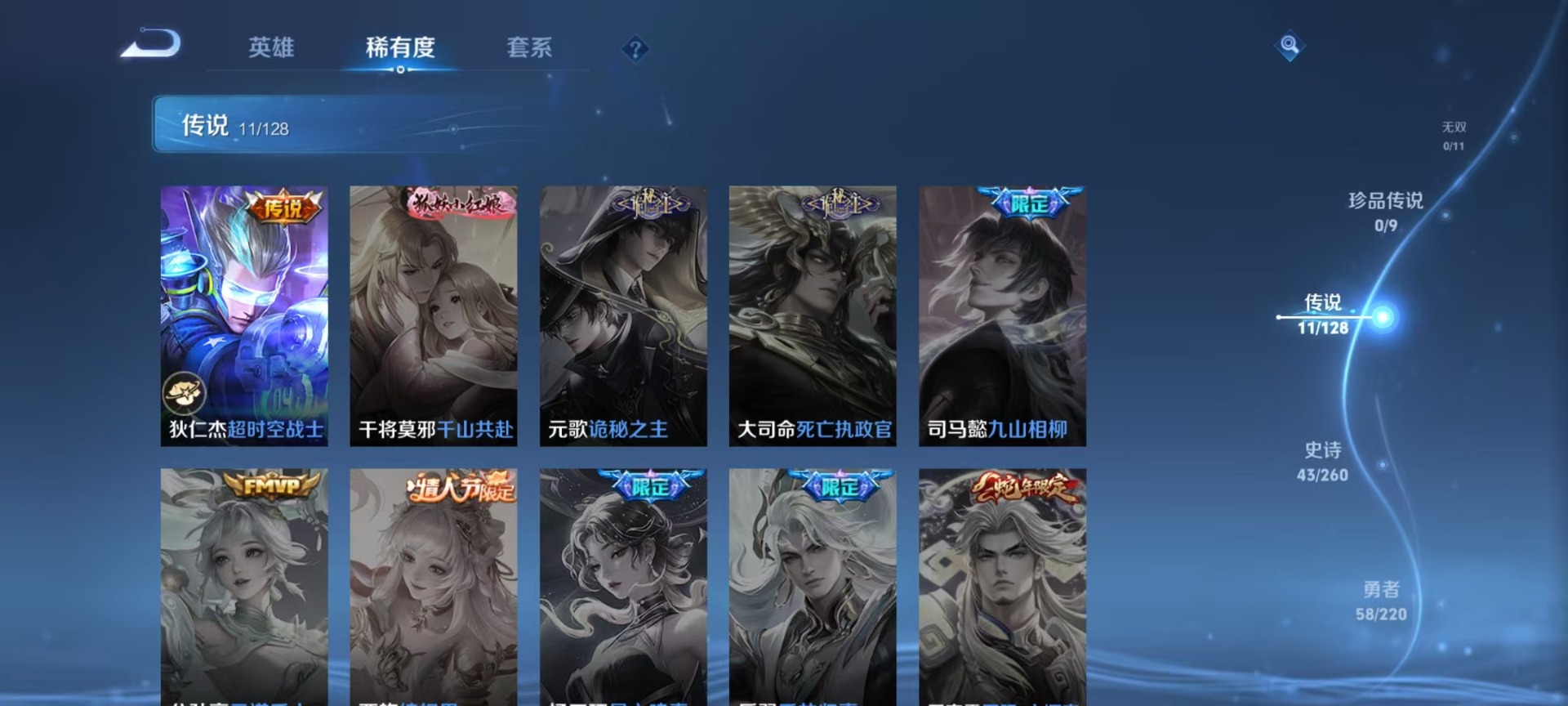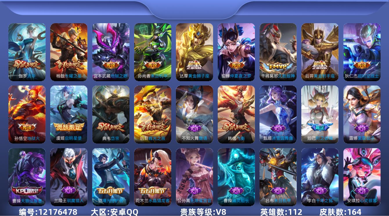 - PX_2057203-贵族等级: V8 英雄数: 124 皮肤数: 286 荣耀水晶: 全息碎影,幻阙歌 星传说: 未来机甲,金色仲夏夜 传说皮: 黄金射手座,冠军飞将,久胜战神,炽阳神光,末日机甲-孙尚香,地狱火,仲夏夜之梦,地狱之眼,超时空战士-狄仁杰,碎云,山海·苍雷引 限定皮: 遇见飞天,李小龙,游园惊梦,梁祝,引擎之心,神威,蜜橘之夏,飞衡,天狼绘梦者,白虎志,青龙志,至尊宝,武陵仙君,