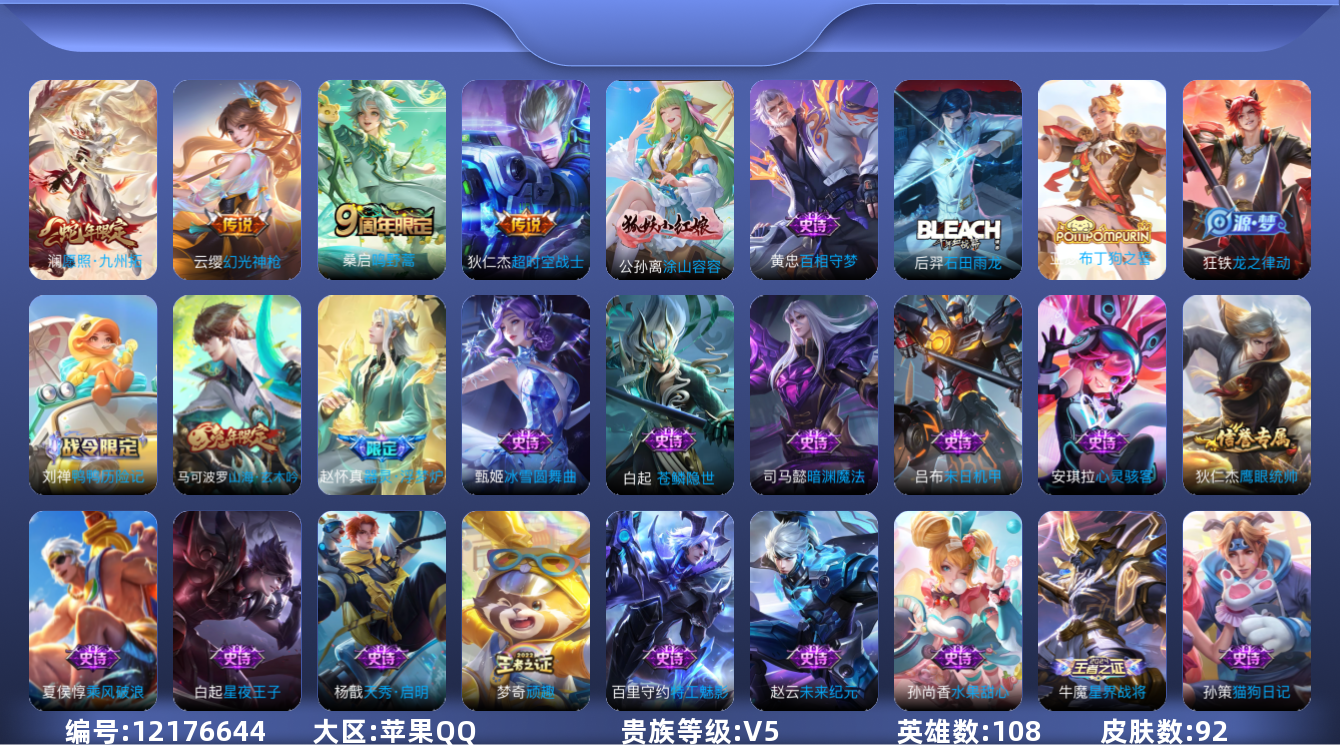 [12176644]V5 4传说 108英雄 92皮肤 可修改实名 优质装备:超时空战士-狄仁杰,涂山容容 传说皮:幻光神枪 珍宝阁皮:优雅恋人 限定皮:愿照·九州拓(澜年限),鸣野蒿,山海·玄木吟(马可年限) 史诗皮:鸭鸭历险记-刘禅,苍鳞隐世,器灵·浮梦炉,星界战将,龙之律动,布丁狗之誓,石田雨龙,茶境仙,百相守梦-黄忠,特工魅影,蒙恬荣光圣徽,偶像歌手,末日机甲-吕布,猫狗日记-孙策,水果甜心,星夜王子,心灵骇客,功夫厨神,德古拉伯爵,鬼剑武藏,暗渊魔法,乐园奇幻夜,天秀·启明,乘风破浪,逐浪之夏,圣诞狂欢,鹰眼统帅,魅力维加斯,未来纪元-赵云