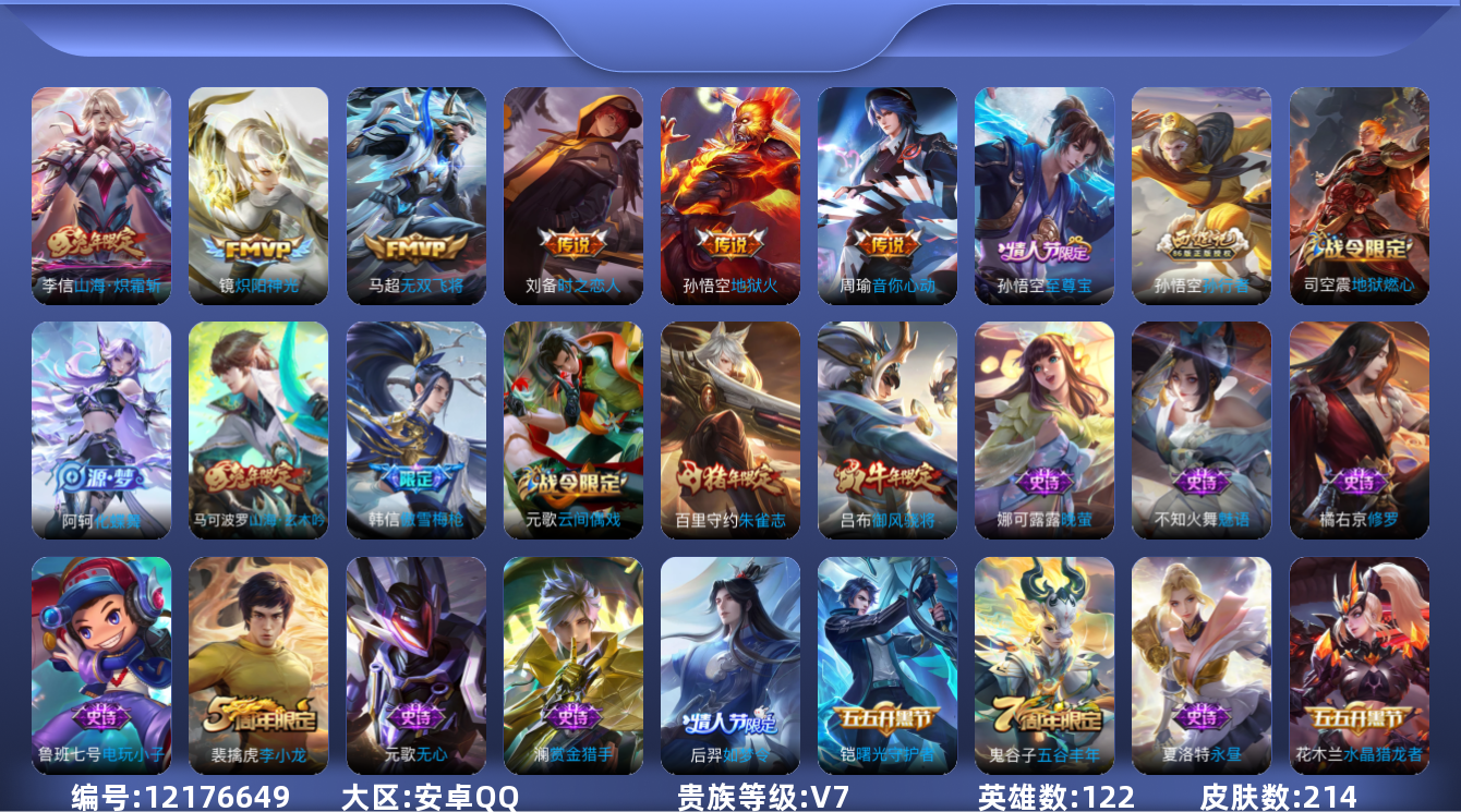 - PX_2095935-实名: 可修改 贵族等级: V5 英雄数: 124 皮肤数: 163 传说皮: 乘龙·问璇玑 限定皮: 李小龙,梁祝,御风骁将,引擎之心,飞衡,大圣娶亲,五谷丰年,山海·玄木吟,鸣野蒿,逐霄战戟