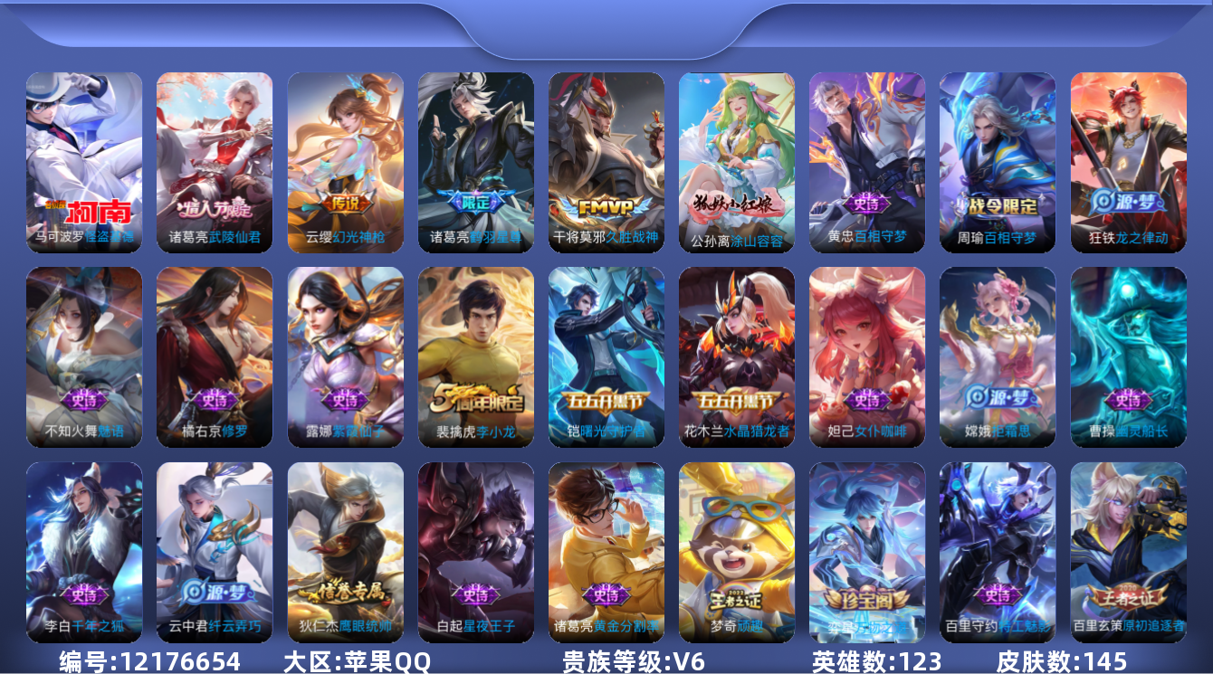 [12176654]V6 1珍品传说 4传说 123英雄 145皮肤 周瑜小国标 可修改实名 优质装备:怪盗基德,久胜战神,鹤羽星尊,涂山容容 传说皮:幻光神枪 珍宝阁皮:万物之道 限定皮:武陵仙君(小桃花),李小龙 史诗皮:星界战将,龙之律动,百相守梦-周瑜,百相守梦-黄忠,紫霞仙子,黄金分割率,特工魅影,千年之狐,魅语,蒙恬荣光圣徽,乱世虎臣,节奏热浪,修罗,女仆咖啡,水果甜心,星夜王子,暗隐猎兽者,幽灵船长,鬼剑武藏,地狱岩魂,纤云弄巧,拒霜思,缤纷独角兽,水晶猎龙者,曙光守护者,金属风暴,原初追逐者,圣诞狂欢,圣诞恋歌,鹰眼统帅,魅力维加斯,黎明之约,未来纪元-赵云