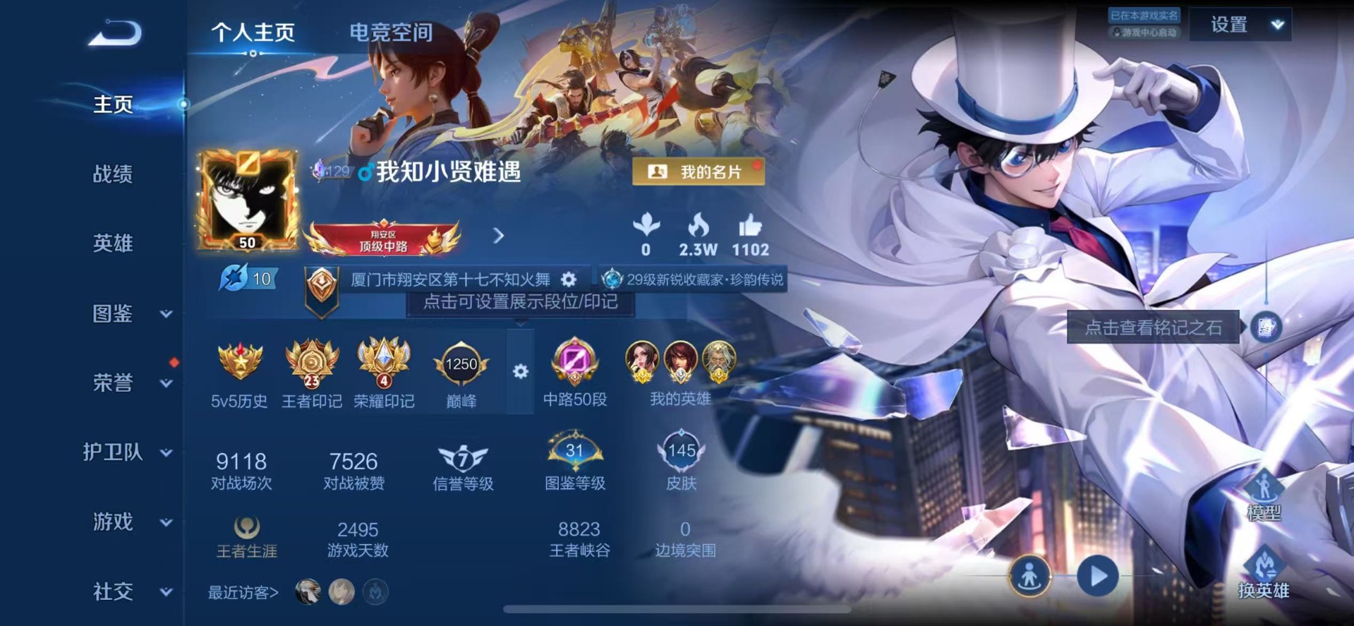 - [11547834]V9 4典藏 15传说 122英雄 192皮肤 可修改实名 优质装备:无限飓风号(高达),活力突击,鸣剑·曳影,全息碎影(猴子典藏),黄金狮子座,黄金射手座,冠军飞将,云鹰飞将(小将军),黄金白羊座,猫影幻舞,久胜战神,一念神魔,云霓雀翎,末日机甲-孙尚香(绿蚂蚱),淬星耀世,鹤羽星尊 珍宝阁皮:玩趣恶龙 限定皮:鸣野蒿,遇见飞天,五谷丰年,游园惊梦,猪悟能,匿光追影者,寅虎·赤拳(老虎年限) 史诗皮:白龙吟,真我赫兹(百里守约),江河有灵,冰冠公主,电玩·爆裂旋风,暗夜猫娘,末日机甲-吕布,猫狗日记-孙策,乱世虎臣,摇滚巨星,绅士熊喵,星夜王子,心灵骇客,德古拉伯爵,暗隐猎兽者,幽灵船长,鬼剑武藏,心灵战警,乐园奇幻夜,舞动绿茵,纤云弄巧,逐浪之夏,水晶猎龙者,曙光守护者,金属风暴,圣诞狂欢,鹰眼统帅,魅力维加斯