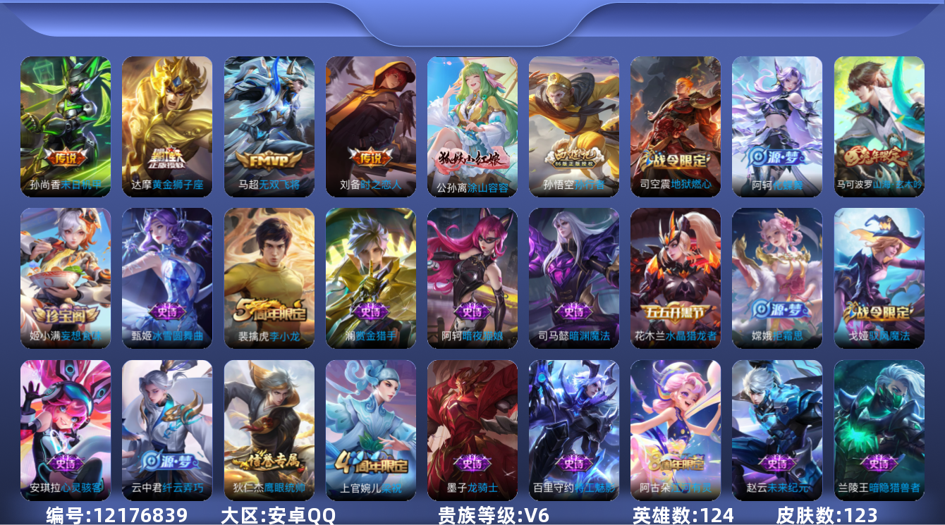 - [11982321]【商品标题】:安卓Q-V7-最强王者段位-124英雄-213皮肤-0典藏-0珍品无双-0无双-0珍品传说-7传说-51史诗 【传说皮肤】:妲己愿照众生和,露娜霜月吟,镜炽阳神光,貂蝉仲夏夜之梦,孙尚香末日机甲,孙悟空地狱火,狄仁杰超时空战士 【限定皮肤】:姜子牙天穹之誓,狄仁杰阴阳师,赵云皇家上将,孙尚香蔷薇恋人,高渐离死亡摇滚,芈月重明,周瑜赤莲之焰,元歌云间偶戏,元歌无心,夏侯惇朔风刀,典韦穷奇,狄仁杰魔术师,狄仁杰万华元夜,项羽海滩派对,老夫子醍醐杖,程咬金演武夺筹,兰陵王驯魔猎人,亚瑟潮玩骑士王,孙悟空大圣娶亲,孙悟空孙行者,李元芳云中旅人,钟馗驱傩正仪,干将莫邪冰霜恋舞曲,雅典娜黎明之约,鬼谷子原初探秘者,鬼谷子五谷丰年,百里玄策原初追逐者,弈星混沌棋,沈梦溪大漠名商,明世隐疑决卦,裴擒虎擒涛扼浪,狂铁御狮,米莱狄御霄,云中君纤云弄巧,嫦娥拒霜思,鲁班大师探海日志,桑启海盐诗旅,艾琳女武神,阿古朵江河有灵,张良古海寻踪,蒙恬荣光圣徽,鬼谷子天穹祈灯,刘邦剑破天穹,上官婉儿群星魔术团,程咬金群星魔术团,周瑜熔金海岸 【赛季限定】:芈月重明,夏侯惇朔风刀,典韦穷奇,狄仁杰万华元夜,老夫子醍醐杖,程咬金演武夺筹,张良古海寻踪,李元芳云中旅人,钟馗驱傩正仪,雅典娜黎明之约,鬼谷子原初探秘者,百里玄策原初追逐者,弈星混沌棋,沈梦溪大漠名商,明世隐疑决卦,裴擒虎擒涛扼浪,狂铁御狮,米莱狄御霄,鲁班大师探海日志,桑启海盐诗旅,鬼谷子天穹祈灯,蒙恬荣光圣徽,刘邦剑破天穹,姜子牙天穹之誓 【战令限定】:周瑜赤莲之焰,元歌云间偶戏,兰陵王驯魔猎人,亚瑟潮玩骑士王 【史诗皮肤】:露娜紫霞仙子,阿轲暗夜猫娘,赵云皇家上将,赵云未来纪元,甄姬冰雪圆舞曲,狄仁杰魔术师,宫本武藏鬼剑武藏,孙尚香蔷薇恋人,孙尚香水果甜心,墨子金属风暴,吕布圣诞狂欢,曹操幽灵船长,李白千年之狐,吕布末日机甲,张飞乱世虎臣,花木兰水晶猎龙者,诸葛亮黄金分割率,雅典娜冰冠公主,百里守约特工魅影,蔡文姬舞动绿茵,程咬金功夫厨神,白起星夜王子,阿轲节奏热浪,孙策猫狗日记,大乔猫狗日记,干将莫邪冰霜恋舞曲,孙悟空大圣娶亲,狄仁杰鹰眼统帅,兰陵王驯魔猎人,不知火舞魅语,橘右京修罗,百里玄策原初追逐者,云中君纤云弄巧,元歌云间偶戏,孙悟空孙行者,嫦娥拒霜思,雅典娜黎明之约,澜赏金猎手,艾琳奇遇舞章,鬼谷子五谷丰年,元