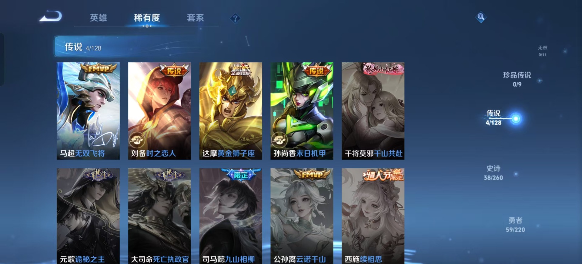 - [11296699]V8 1典藏 3珍品传说 18传说 125英雄 296皮肤 典藏英雄武则天 可修改实名 荣耀水晶:星空梦想(太空人) 珍品传说:怪盗基德,朽木白哉,黑崎一护 传说皮:云诺千山,幻光神枪,黄金狮子座,黄金射手座,黄金白羊座,地狱火,末日机甲-孙尚香(绿蚂蚱),云霓雀翎,一念神魔,胖达荣荣,时之恋人-刘备(电焊工),飞鸢探春,超时空战士-狄仁杰,神器·狴犴令,妄想实况 珍宝阁皮:妄想食味,优雅恋人 限定皮:愿照·岁时盈(虞姬年限),逐霄战戟,陌上桑,鸣野蒿,高山流水,五谷丰年,游园惊梦,梁祝,逐梦之星,烈魂,李小龙,孙行者,乒乒小将,山海·玄木吟(马可年限) 史诗皮:小牛鸭,石田雨龙,百相守梦-百里守约,东方月初,破空之剑,电玩小子(小书包),黄金分割率,特工魅影,千年之狐,末日机甲-莱西奥,江河有灵,百解令(蒙犽),蒙恬荣光圣徽,冰冠公主,青蛇,偶像歌手,晚萤,魅语,白蛇,电玩·爆裂旋风,末日机甲-吕布,猫狗日记-孙策,猫狗日记-大乔,乱世虎臣,修罗,女仆咖啡,摇滚巨星,水果甜心,绅士熊喵,天才门将,星夜王子,心灵骇客,时之奇旅-安琪拉,功夫厨神,德古拉伯爵,暗隐猎兽者,幽灵船长,鬼剑武藏,心灵战警,舞动绿茵,地狱岩魂,纤云弄巧,缤纷独角兽,乘风破浪,逐浪之夏,龙鼓争鸣,月团寄思,水晶猎龙者,曙光守护者,箭羽风息,金属风暴,原初追逐者,圣诞狂欢,圣诞恋歌,鹰眼统帅,暗夜贵公子,魅力维加斯,黎明之约,奇遇舞章,未来纪元-赵云
