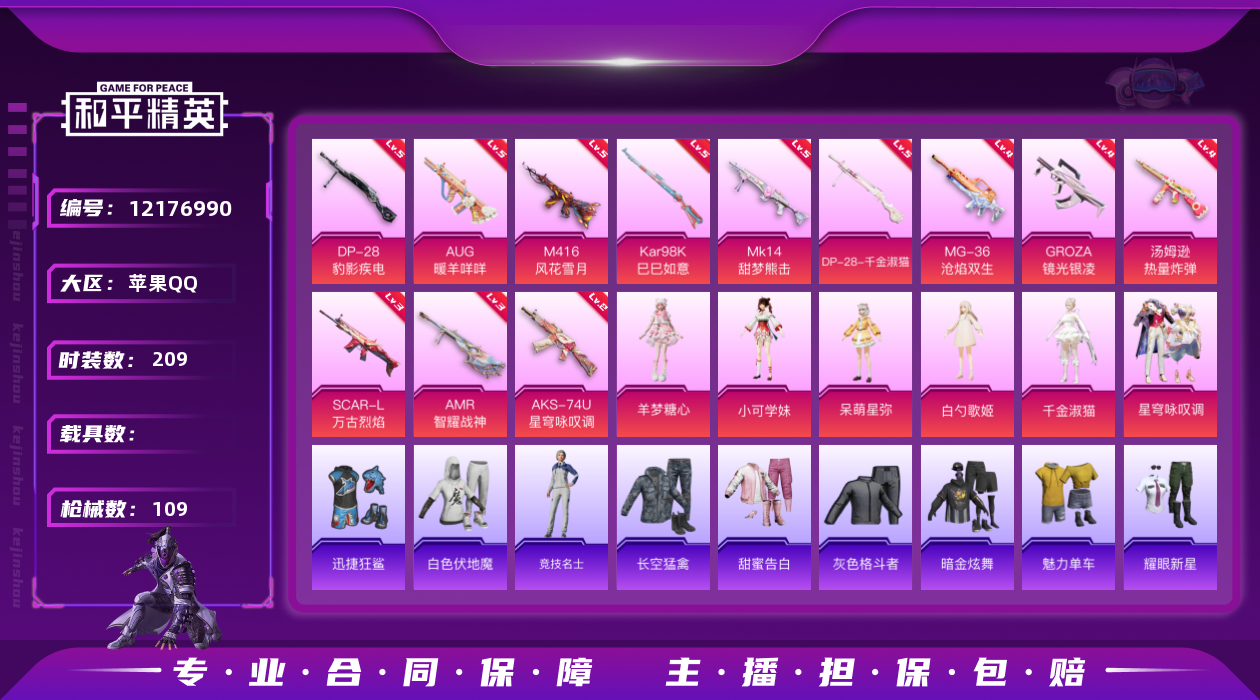 [12176990]6粉装 12特效枪 可二次 可修改实名 优质装备:M416风花雪月,SCAR-L 万古烈焰,DP-28-千金淑猫,千金淑猫,GROZA-镜光银凌,AUG-暖羊咩咩,AMR-智耀战神,星穹咏叹调,AKS-74U-星穹咏叹调,MK14-甜梦熊击,汤姆逊-热量炸弹,羊梦糖心,Kar98K-巳巳如意 热门装扮:呆萌星弥,白勺歌姬,小可学妹,迅捷狂鲨 稀有枪皮:MG-36-沧焰双生,DP-28-豹影疾电 五级特效枪:五级DP-28-千金淑猫,五级Kar98K-巳巳如意,五级DP-28-豹影疾电,五级AUG-暖羊咩咩,五级MK14-甜梦熊击,五级M416-风花雪月 四级特效枪:四级GROZA-镜光银凌,四级汤姆逊-热量炸弹,四级MG-36-沧焰双生 三级特效枪:三级AMR-智耀战神,三级SCAR-L-万古烈焰 二级特效枪:二级AKS-74U-星穹咏叹调 紫色装扮:SS31特训套装,SS30特训套装,云朵鹅,雪绒豹,SS33特训套装,顶瓜瓜,灵公主,魅力单车,鹤鸣,龙的传人,冰河战士,龙魂突击队,长空猛禽,灰色格斗者,暗金炫舞,柠萌假日,缤纷果语,耀眼新星,甜蜜告白,白色伏地魔,SS29特训,雏菊兔兔,狂花道·娜可露露,萝兰蝴蝶,粉日山川,鱼渊荷华,燕燕于飞,巳巳如意,森林游猎者,海琴烟,石蕴玉辉,智谋强哥,青团波波,糖糖葫芦,棉花软糖,竞技名士,都市丽猫,摩登魅猫,俏兔智灵,神气柴柴,懵萌河马,SS24特训(SS24特训套装),大橘大利,星渊小夜曲,星影赞美诗,紫幽梦,SS32特训服(SS32特训套装),蓝冰羽,光之冒险,粉恋花,恋语绒绒 优质战备:萌物绒绒降落伞,千金淑猫降落伞,幻星舰长降落伞,雀灵庇佑飞行器,凤舞九天飞行器,幻影飞狐降落伞,祥瑞起舞飞行器,月影灵韵降落伞,彩虹独角兽降落伞,樱桃泡泡降落伞,白勺歌姬降落伞,春暖花开降落伞