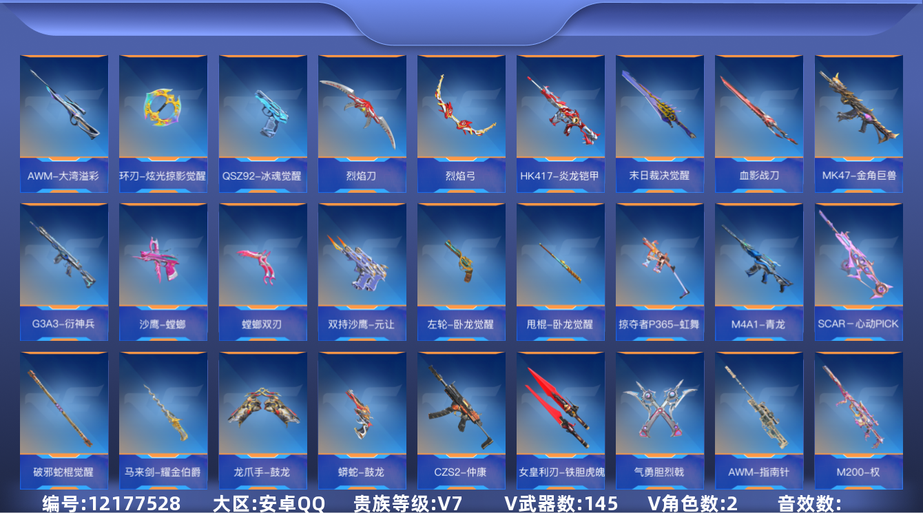 [12177528]V7 可二次 可修改实名 V7 13王者武器 145英雄武器 2英雄角色 263万化 枪王SSS 武器:王者之影,王者之心,王者之翼,王者之蝶,AK47-奉先,VEPR12-本初,M4A1-星象,M200-幻神,81式-光明之神,CZS2-善财童子,王者之魂,王者之锋,COP 357-堕天神,COP 357-雷霆,AK47-无影,M4A1-死神,M4A1-黑骑士,巴雷特-极光,巴雷特-毁灭,QBZ03-金色蔷薇,QBZ03-死神,刘易斯-天使,双持斯泰尔-天使,AK47-黑鲨,AK47-猩红传说,AK47-血武士,M4A1-破空冰刃,M4A1-运输船,M4A1-猎神,M4A1-心动次元,M4A1-海骑士,SCAR-幽暗骑士,AK12-天启,M14EBR-天神,98K-星神,AWM-天龙,09式狙-天神,M14EBR-拂影,CBJ-MS-毒蜂,汤姆逊-烈龙,加特林-蟒蛇,MK47-鼓龙,地狱火,AA12-火药,CZS2-血月,9A91-魔蜥觉醒,AN94-赳赳秦师,M4A1-太白诗仙,柯尔特-仲达,方天画戟,双持柯尔特-极光,双管猎枪-未来战士,MK23-双脊龙,M16-恶魔,沙鹰-修罗,沙鹰-神兵修罗,气手枪-血月,M4A1-铁胆虎魄,手斧-机械迷城,马来剑-毁灭,尼泊尔-冰锋觉醒,王者之翼烟雾弹,王者之翼闪光弹,王者之心烟雾弹,王者之心手雷,王者之心闪光弹,王者之势烟雾弹,USP-神罚,神罚战斧,丛林匕首-庆龙觉醒,屠龙,太白诗仙扇,蝴蝶刀-天神,女皇利刃-铁胆虎魄,烟雾弹-天使,高爆手雷-堕天神,黑骑士闪光弹,黑骑士手雷,火麒麟手雷,机械纪元闪光弹,燃烧弹-游骑兵,闪光弹-游骑兵,高爆手雷-无限,烟雾弹-星象,M4A1-青龙,SCAR-心动PICK,掠夺者P365-虹舞,炽芒蝶刀,气勇胆烈戟,螳螂双刃,龙爪手-鼓龙,手雷-星象,手雷-鼓龙,蟒蛇-鼓龙,COP 357-安琪拉,左轮-卧龙觉醒,沙鹰-螳螂,双持沙鹰-元让,破邪蛇棍觉醒,甩棍-卧龙觉醒,马来剑-耀金伯爵,CZS2-仲康,燃烧弹-星象,M200-权,AWM-指南针,烟雾弹-星际宇航,G3A3-衍神兵,MK47-金角巨兽,血影战刀,末日裁决觉醒,改装GLOCK-魔杀族,手雷-遁天梭-钻山锥,烟雾弹-遁天梭-重山盾,HK417-炎龙铠甲,QSZ92-冰魂觉醒,烈焰刀,烈焰弓,手雷-游骑兵,AWM-大湾