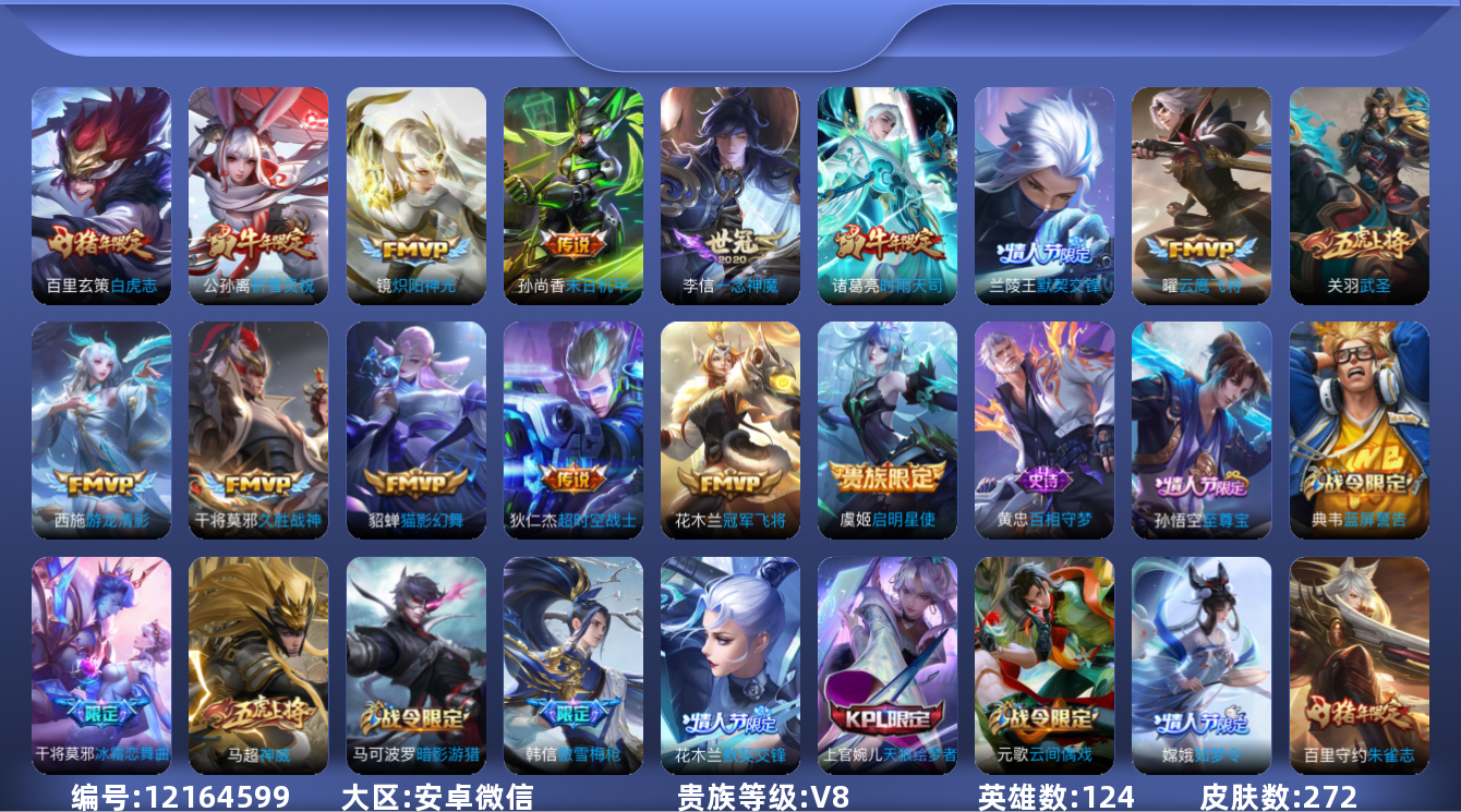 [12164599]V8 15传说 124英雄 272皮肤 可修改实名 优质装备:冠军飞将,云鹰飞将(小将军),猫影幻舞,久胜战神,炽阳神光,一念神魔,末日机甲-孙尚香(绿蚂蚱),游龙清影(小青龙),超时空战士-狄仁杰 珍宝阁皮:优雅恋人,蔷薇恋人 限定皮:至尊宝,白虎志(电光耗子),傲雪梅枪,寅虎·展翼(孙膑年限),白鹤梁神女,时雨天司(水龙头),神威(电光马子),飞衡(韩信年限),高山流水,五谷丰年,幽恒(沐浴露),武圣,梁祝,御风骁将(吕布年限),奔雷神使(牛魔年限),祈雪灵祝(雪兔子),天狼绘梦者,李小龙,朱雀志(守约年限),如梦令-嫦娥,如梦令-后羿,霸王别姬-项羽,霸王别姬-虞姬,默契交锋-兰陵王,默契交锋-花木兰,猪悟能,冰霜恋舞曲,匿光追影者,寅虎·心曲(虎婆) 史诗皮:百相守梦-黄忠,紫霞仙子,黄金分割率,千年之狐,冰冠公主,魅语,电玩·爆裂旋风,晚萤,偶像歌手,猫狗日记-孙策,时之恋人-孙尚香,乱世虎臣,修罗,摇滚巨星,水果甜心,绅士熊喵,天才门将,功夫厨神,德古拉伯爵,暗隐猎兽者,鬼剑武藏,地狱岩魂,诗语江南,纤云弄巧,繁星吟游(呼啦呼啦),拒霜思,逐浪之夏,龙鼓争鸣,曙光守护者,金属风暴,原初追逐者,圣诞恋歌,鹰眼统帅,魅力维加斯,黎明之约