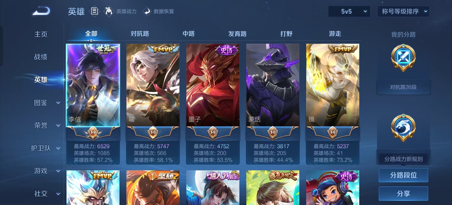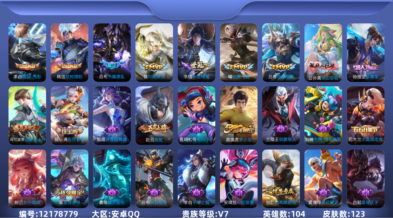 [12178779]V7 2典藏 5传说 104英雄 123皮肤 可修改实名 优质装备:鸣剑·曳影,弑枪猎影(韩信典藏),云鹰飞将(小将军),炽阳神光,一念神魔,涂山容容 珍宝阁皮:妄想食味 限定皮:至尊宝,怒海麟威,龙胆,李小龙,天魔缭乱,山海·玄木吟(马可年限) 史诗皮:星界战将,蔬乡物语(鲁班七号),电玩小子(小书包),千年之狐,江河有灵,蒙恬荣光圣徽,冰冠公主,偶像歌手,电玩·爆裂旋风,龙骑士(小龙虾),末日机甲-吕布,猫狗日记-孙策,节奏热浪,女仆咖啡,水果甜心,星夜王子,心灵骇客,暗隐猎兽者,幽灵船长,鬼剑武藏,心灵战警,地狱岩魂,乘风破浪,水晶猎龙者,金属风暴,原初追逐者,圣诞狂欢,鹰眼统帅,魅力维加斯
