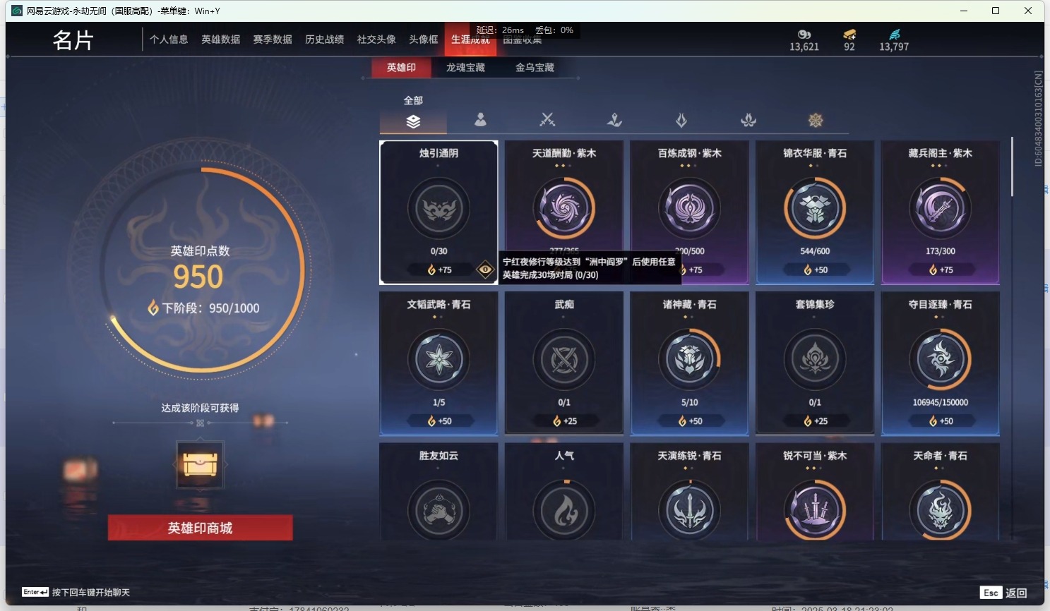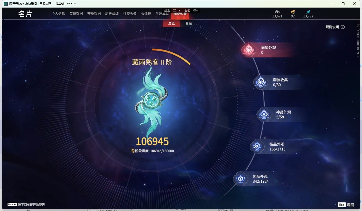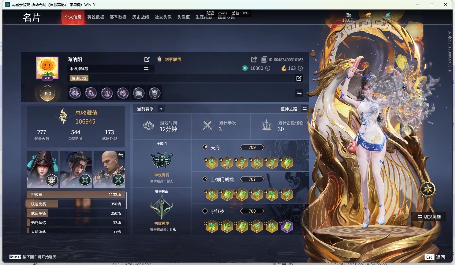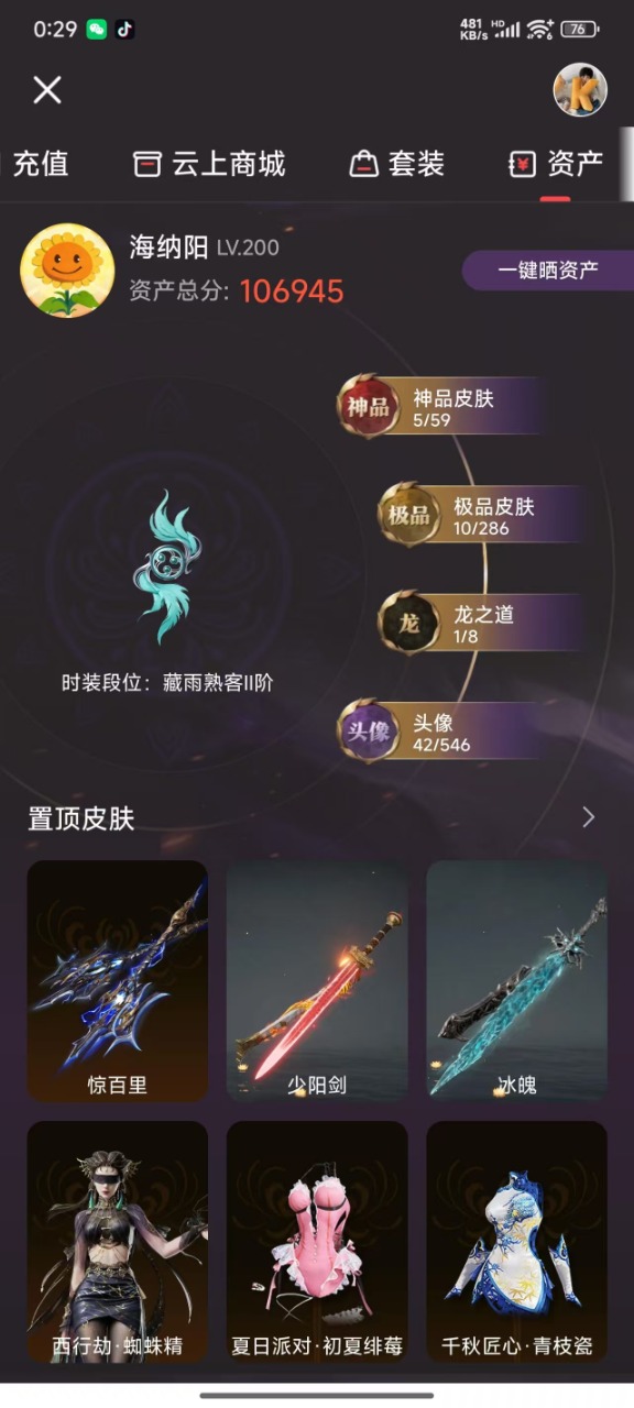 - [12129876]4橙皮 1金皮 4紫皮 16皮肤 14英雄 51卡面 465已用源晶 未定级 优质装备:正义-781-A协议,狂徒-紫阙金琅,幻影-天界神兵2.0,狂徒-日冕雄师,天玄刀,堕天遗武 仪式匕首,影钩 佩枪皮肤:鬼魅-掠影2.0 步枪皮肤:狂徒-虚空遗器 1