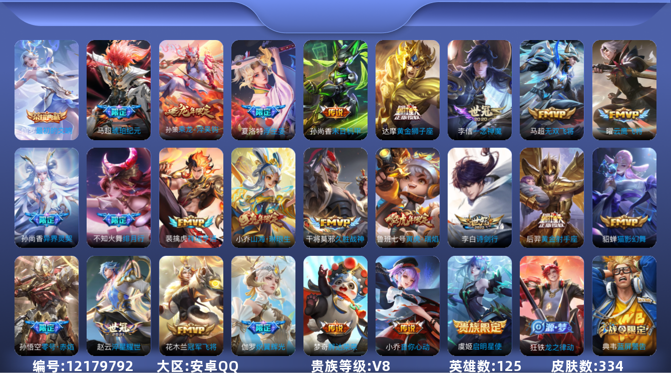[12179792]【商品标题】:安卓Q-V8-至尊星耀IV段位-125英雄-334皮肤-1典藏-0珍品无双-0无双-0珍品传说-24传说-95史诗