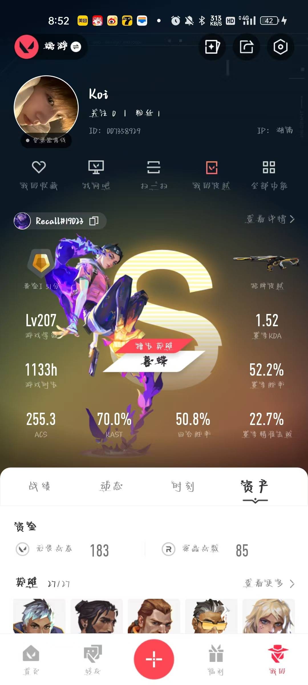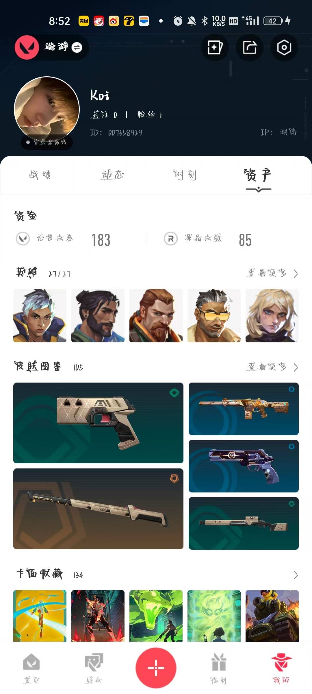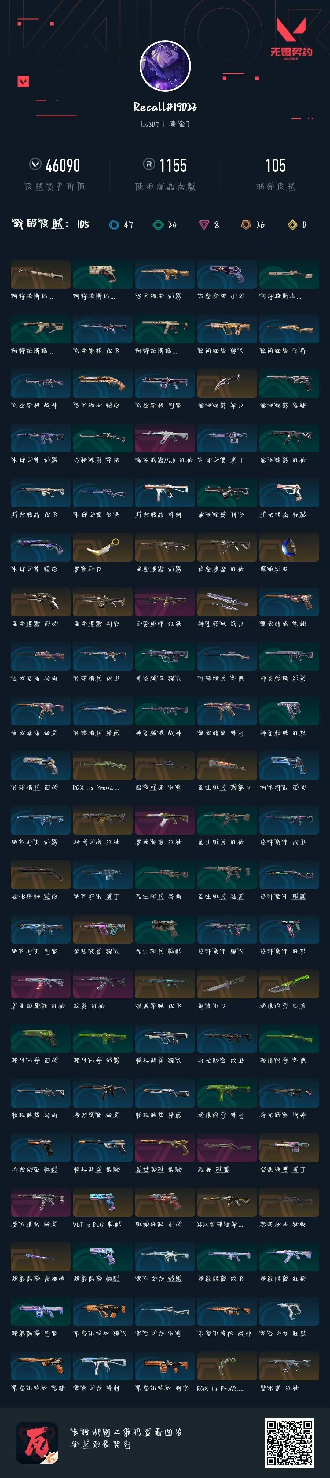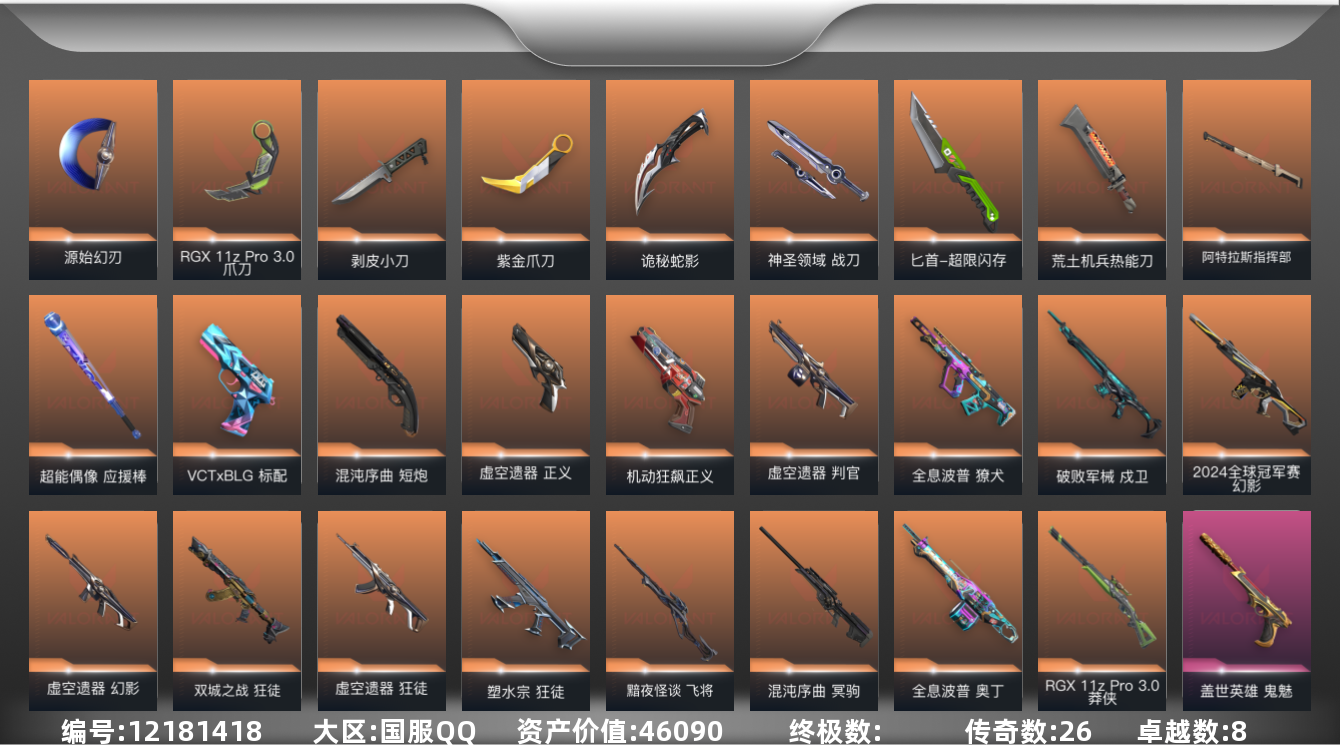 [12181418]26橙皮 8紫皮 105皮肤 27英雄 134卡面 1155已用源晶 黄金 优质装备:狂徒-塑水宗,幻影-2024全球冠军赛,冥驹-混沌序曲,狂徒-掠影,狂徒-紫阙金琅,狂徒-盖亚的复仇,正义-机动狂飙,狂徒-日冕雄师,鬼魅-盖世英雄,剥皮小刀,紫金爪刀,獠犬-全息波普,奥丁-全息波普,戍卫-破败军械,爪刀-RGX 11z Pro 3.0,匕首-超限闪存,荒土机兵热能刀,神圣领域 战刀,源始幻刃,诡秘蛇影,阿特拉斯指挥部,雄鹿-起源,骇灵-堕天遗武 套装:虚空遗器 佩枪皮肤:正义-虚空遗器,短炮-混沌序曲,标配-VCTxBLG 霰弹枪皮肤:判官-虚空遗器 步枪皮肤:狂徒-虚空遗器,幻影-虚空遗器,狂徒-双城之战,狂徒-离子武器2.0 狙击枪皮肤:飞将-黯夜怪谈,莽侠-RGX 11z Pro 3.0 近战武器皮肤:超能偶像 应援棒