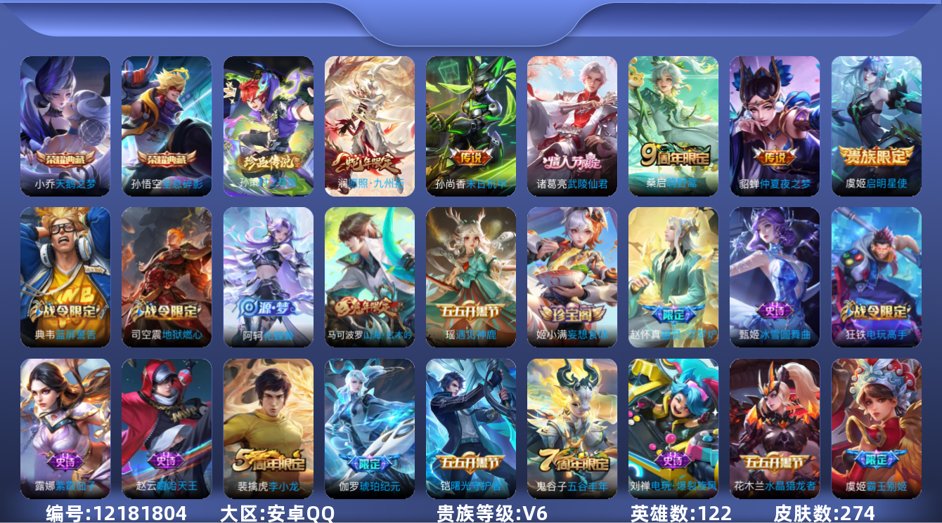 [12181804]【商品标题】:安卓Q-V6-永恒钻石II段位-122英雄-274皮肤-2典藏-0珍品无双-0无双-1珍品传说-6传说-72史诗