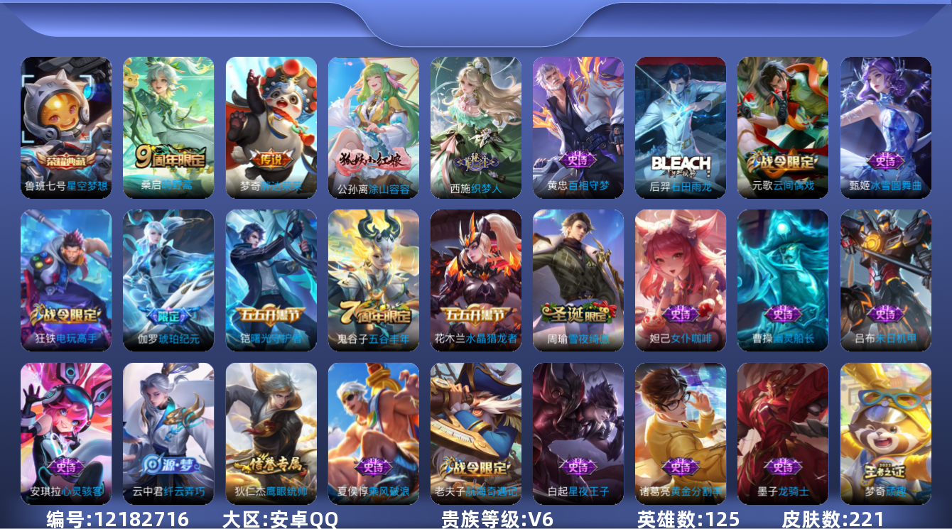 [12182716]【商品标题】:安卓Q-V0-永恒钻石V段位-124英雄-210皮肤-1典藏-0珍品无双-0无双-0珍品传说-2传说-55史诗