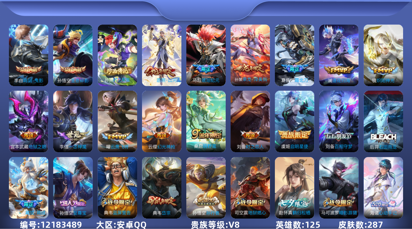 [12183489]【商品标题】:安卓Q-V8-尊贵铂金I段位-125英雄-287皮肤-2典藏-0珍品无双-0无双-1珍品传说-13传说-89史诗
