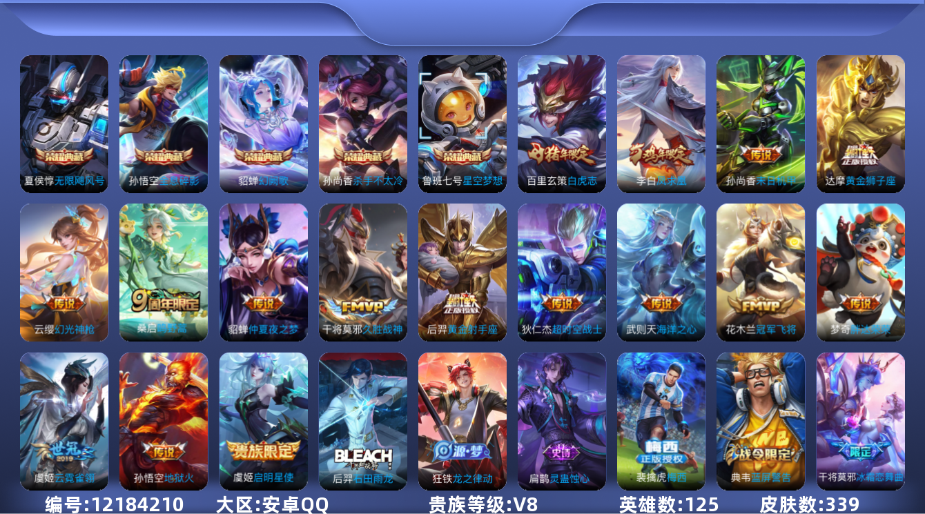 [12184210]【商品标题】:安卓Q-V8-至尊星耀III段位-125英雄-339皮肤-5典藏-0珍品无双-0无双-0珍品传说-16传说-93史诗