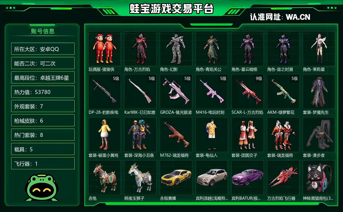 安卓QQ 可二次 当前段位英勇黄金Ⅱ 历史最高段位卓越王牌6星 热力值53780 等级54 套装115 王牌次数6 点券12 外观套装7 枪械皮肤6 热门紫装8 载具5 飞行器1 稀有0 头盔0 背包1