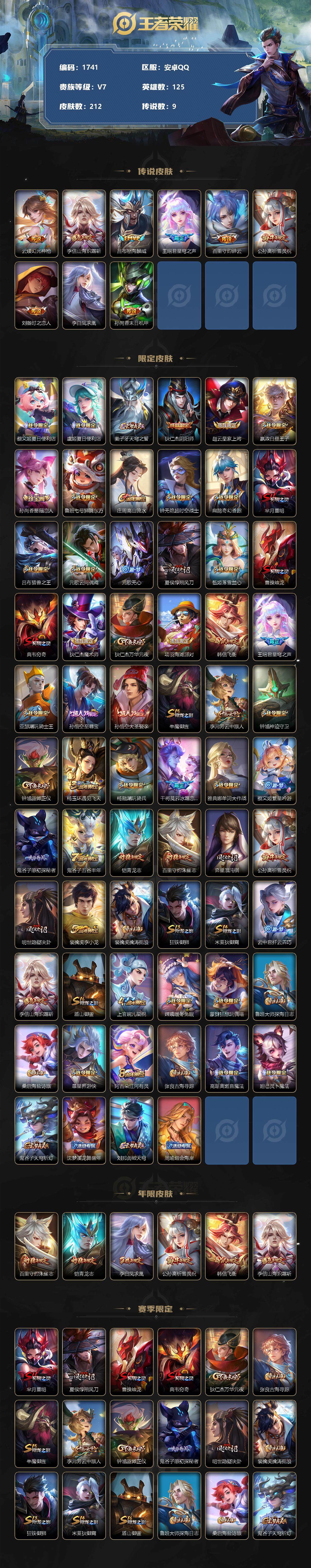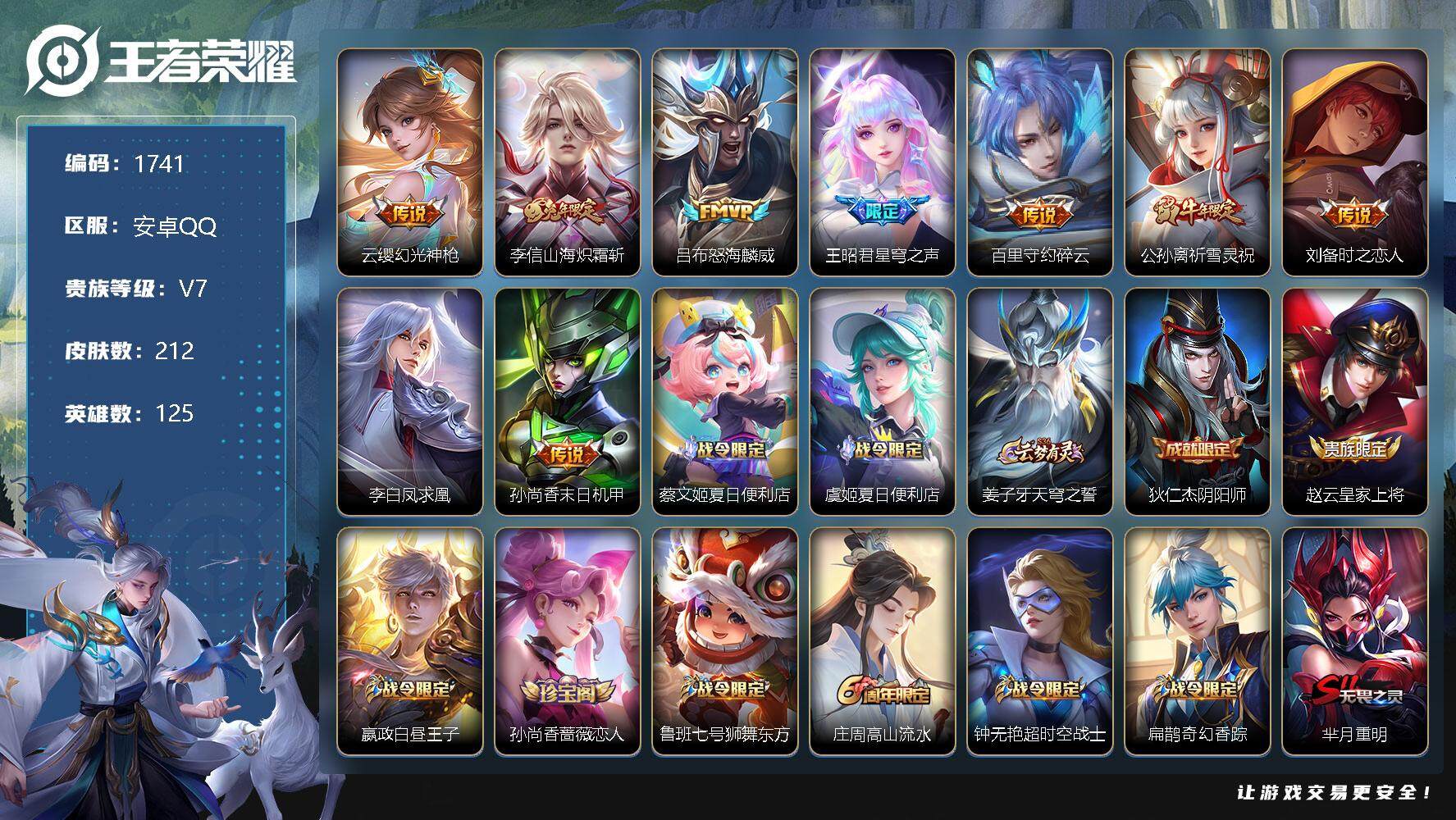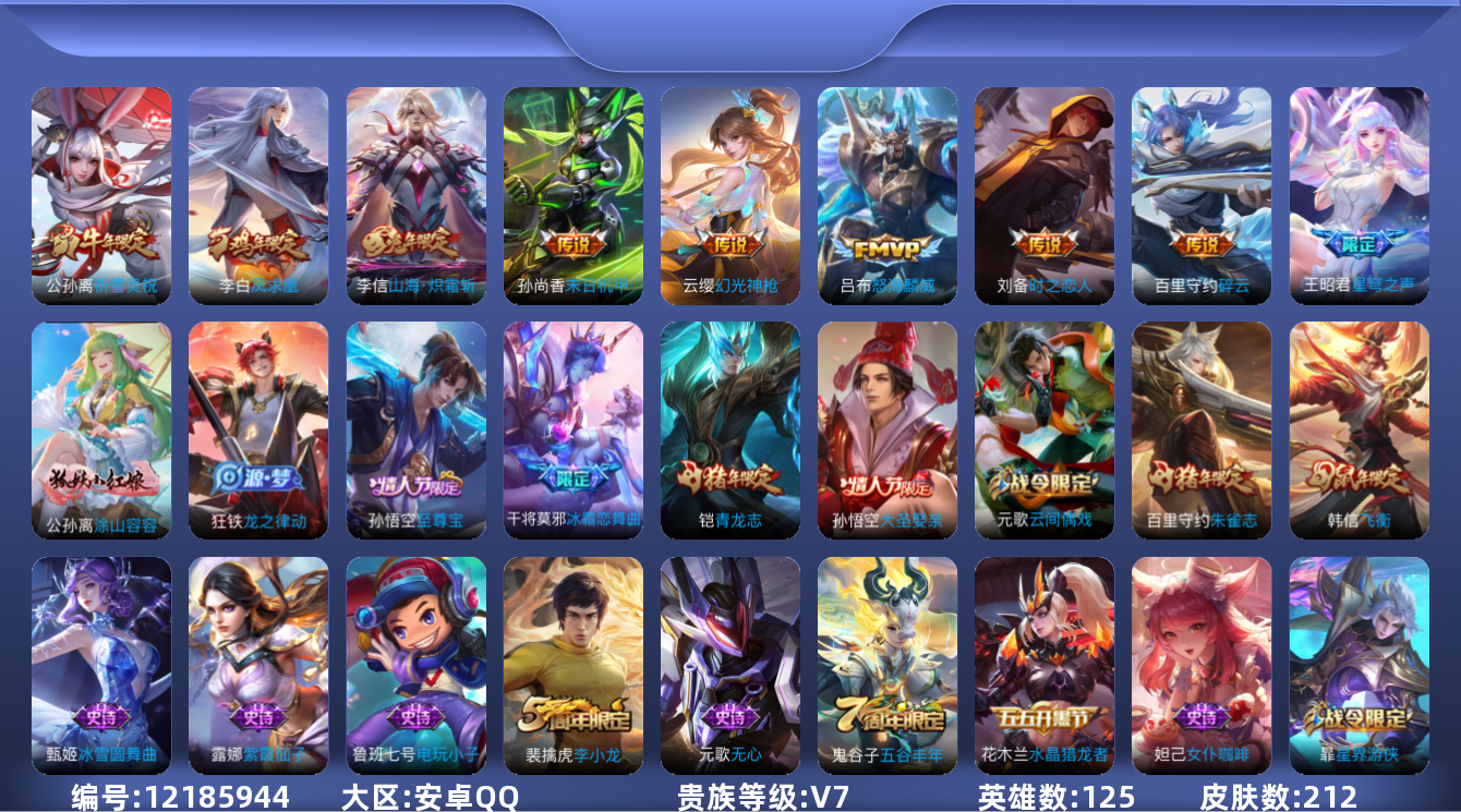 [12185944]【商品标题】:安卓Q-V7-至尊星耀III段位-125英雄-212皮肤-0典藏-0珍品无双-0无双-0珍品传说-9传说-61史诗