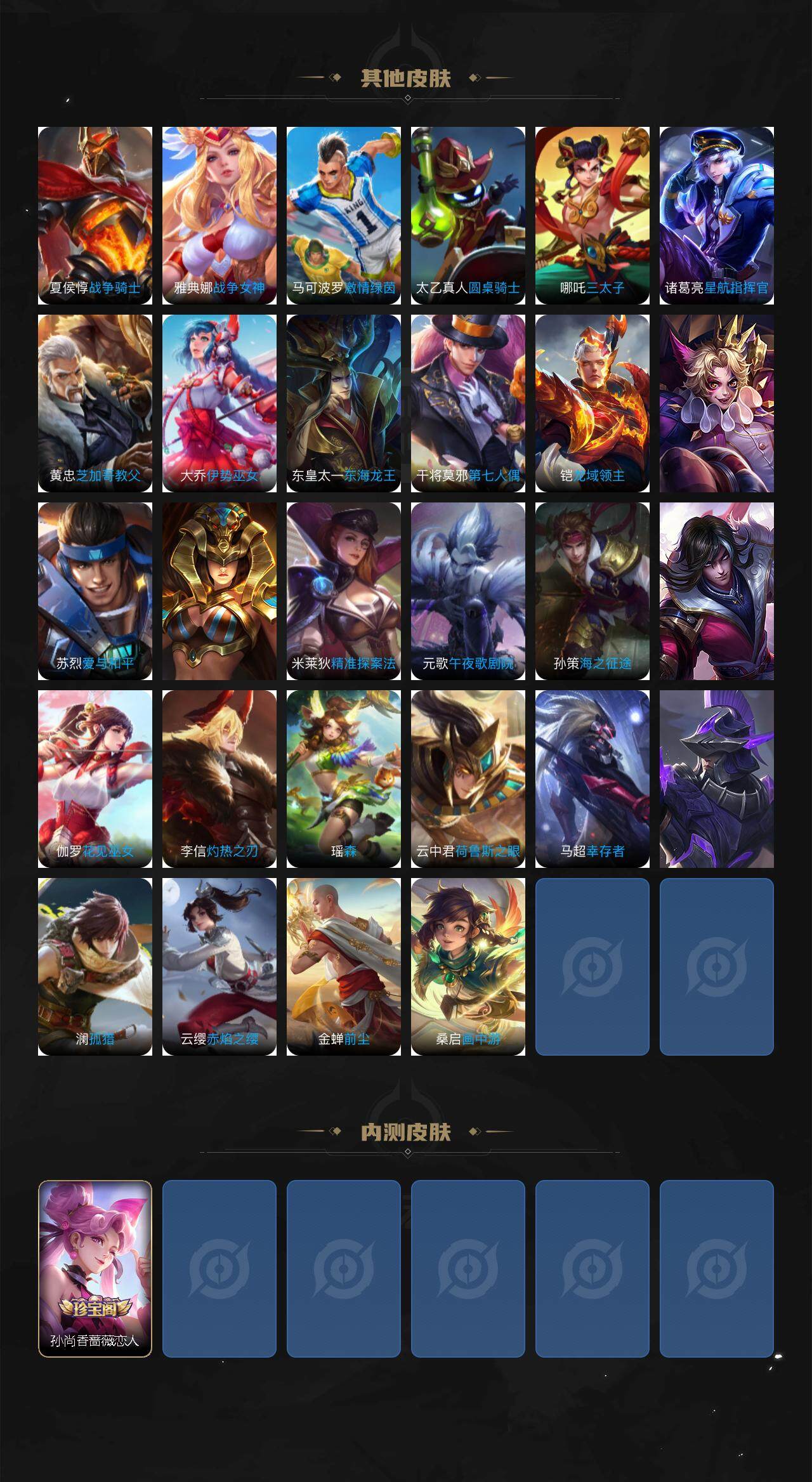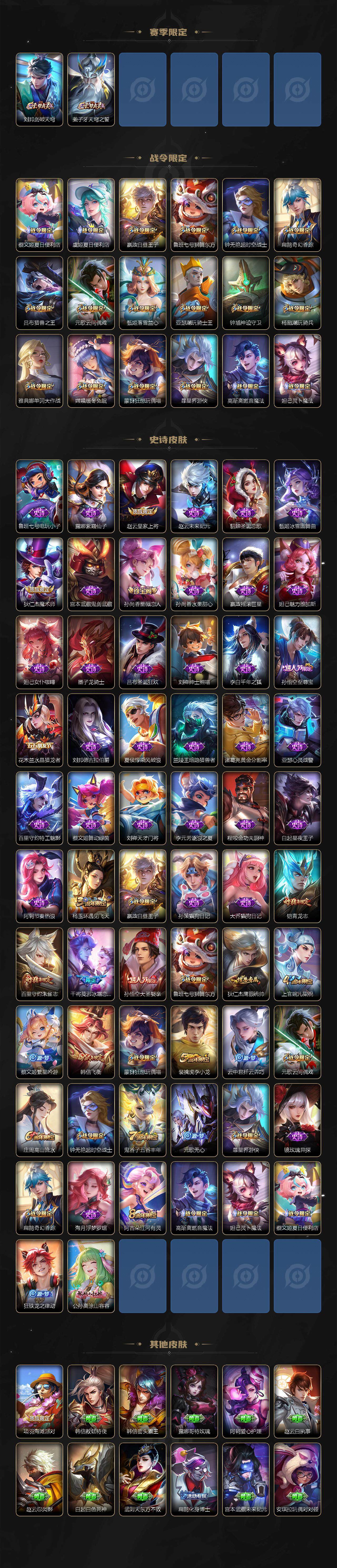 【赛季限定】:芈月重明,夏侯惇朔风刀,曹操烛龙,典韦穷奇,狄仁杰万华元夜,张良古海寻踪,牛魔御旌,李元芳云中旅人,钟馗驱傩正仪,鬼谷子原初探秘者,弈星混沌棋,明世隐疑决卦,裴擒虎擒涛扼浪,狂铁御狮,米莱狄御霄,盾山御銮,鲁班大师探海日志,桑启海盐诗旅,鬼谷子天穹祈灯,刘邦剑破天穹,姜子牙天穹之誓