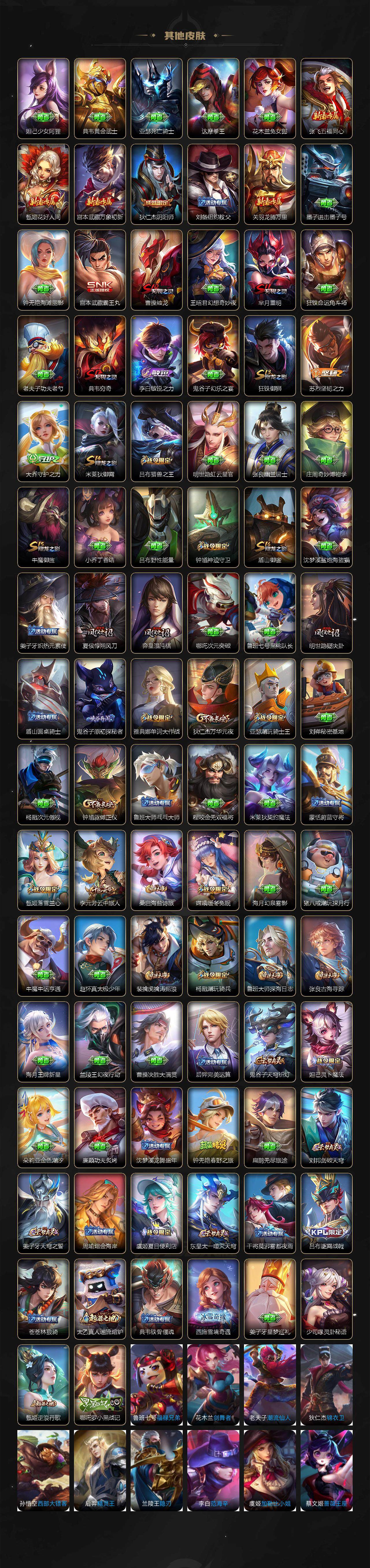 【限定皮肤】:蔡文姬夏日便利店,虞姬夏日便利店,姜子牙天穹之誓,狄仁杰阴阳师,赵云皇家上将,嬴政白昼王子,孙尚香蔷薇恋人,鲁班七号狮舞东方,庄周高山流水,钟无艳超时空战士,扁鹊奇幻香踪,芈月重明,吕布猎兽之王,元歌云间偶戏,元歌无心,夏侯惇朔风刀,甄姬落雪兰心,曹操烛龙,典韦穷奇,狄仁杰魔术师,狄仁杰万华元夜,项羽海滩派对,韩信飞衡,王昭君星穹之声,亚瑟潮玩骑士王,孙悟空至尊宝,孙悟空大圣娶亲,牛魔御旌,李元芳云中旅人,钟馗神迹守卫,钟馗驱傩正仪,杨玉环遇见飞天,杨戬潮玩骑兵,干将莫邪冰霜恋舞曲,雅典娜单词大作战,蔡文姬繁星吟游,鬼谷子原初探秘者,鬼谷子五谷丰年,铠青龙志,百里守约朱雀志,弈星混沌棋,公孙离祈雪灵祝,明世隐疑决卦,裴擒虎李小龙,裴擒虎擒涛扼浪,狂铁御狮,米莱狄御霄,云中君纤云弄巧,李信山海炽霜斩,盾山御銮,上官婉儿梁祝,嫦娥暖冬兔眠,蒙犽狂想玩偶喵,鲁班大师探海日志,桑启海盐诗旅,暃星界游侠,阿古朵江河有灵,张良古海寻踪,高渐离燃音魔法,妲己灵卜魔法,鬼谷子天穹祈灯,沈梦溪龙舞盛年,刘邦剑破天穹,周瑜熔金海岸