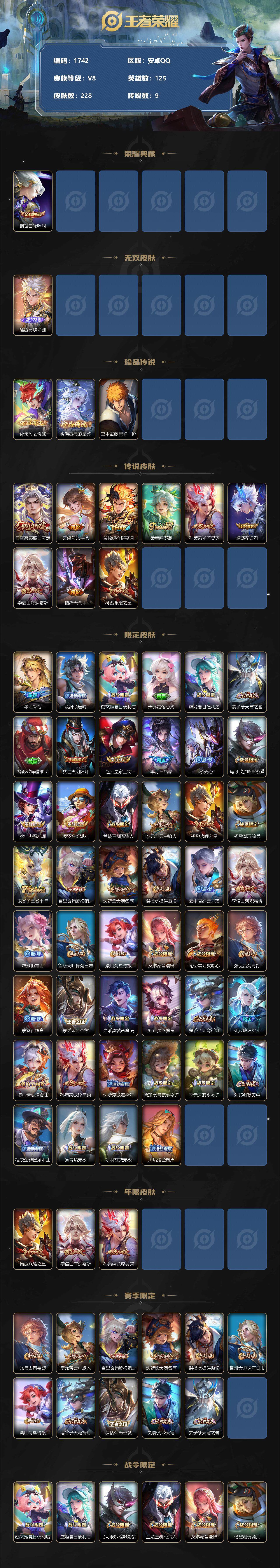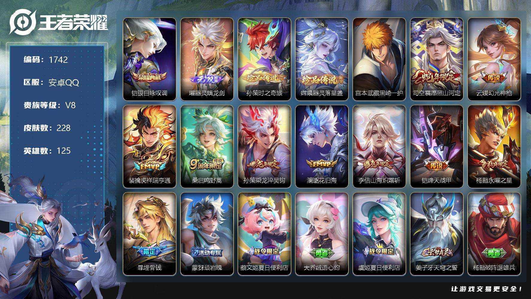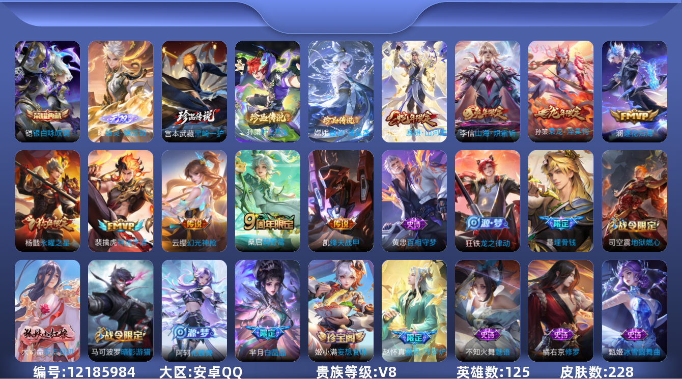 [12185984]【商品标题】:安卓Q-V7-至尊星耀V段位-125英雄-228皮肤-1典藏-0珍品无双-1无双-3珍品传说-9传说-71史诗