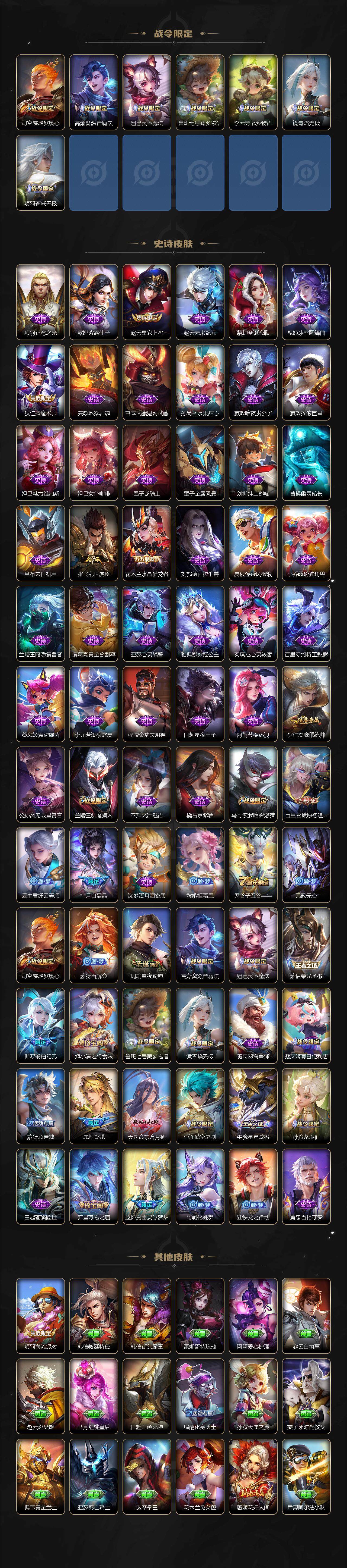 【史诗皮肤】:项羽苍穹之光,露娜紫霞仙子,赵云皇家上将,赵云未来纪元,貂蝉圣诞恋歌,甄姬冰雪圆舞曲,狄仁杰魔术师,廉颇地狱岩魂,宫本武藏鬼剑武藏,孙尚香水果甜心,嬴政暗夜贵公子,嬴政摇滚巨星,妲己魅力维加斯,妲己女仆咖啡,墨子龙骑士,墨子金属风暴,刘禅绅士熊喵,曹操幽灵船长,吕布末日机甲,张飞乱世虎臣,花木兰水晶猎龙者,刘邦德古拉伯爵,夏侯惇乘风破浪,小乔缤纷独角兽,兰陵王暗隐猎兽者,诸葛亮黄金分割率,亚瑟心灵战警,雅典娜冰冠公主,安琪拉心灵