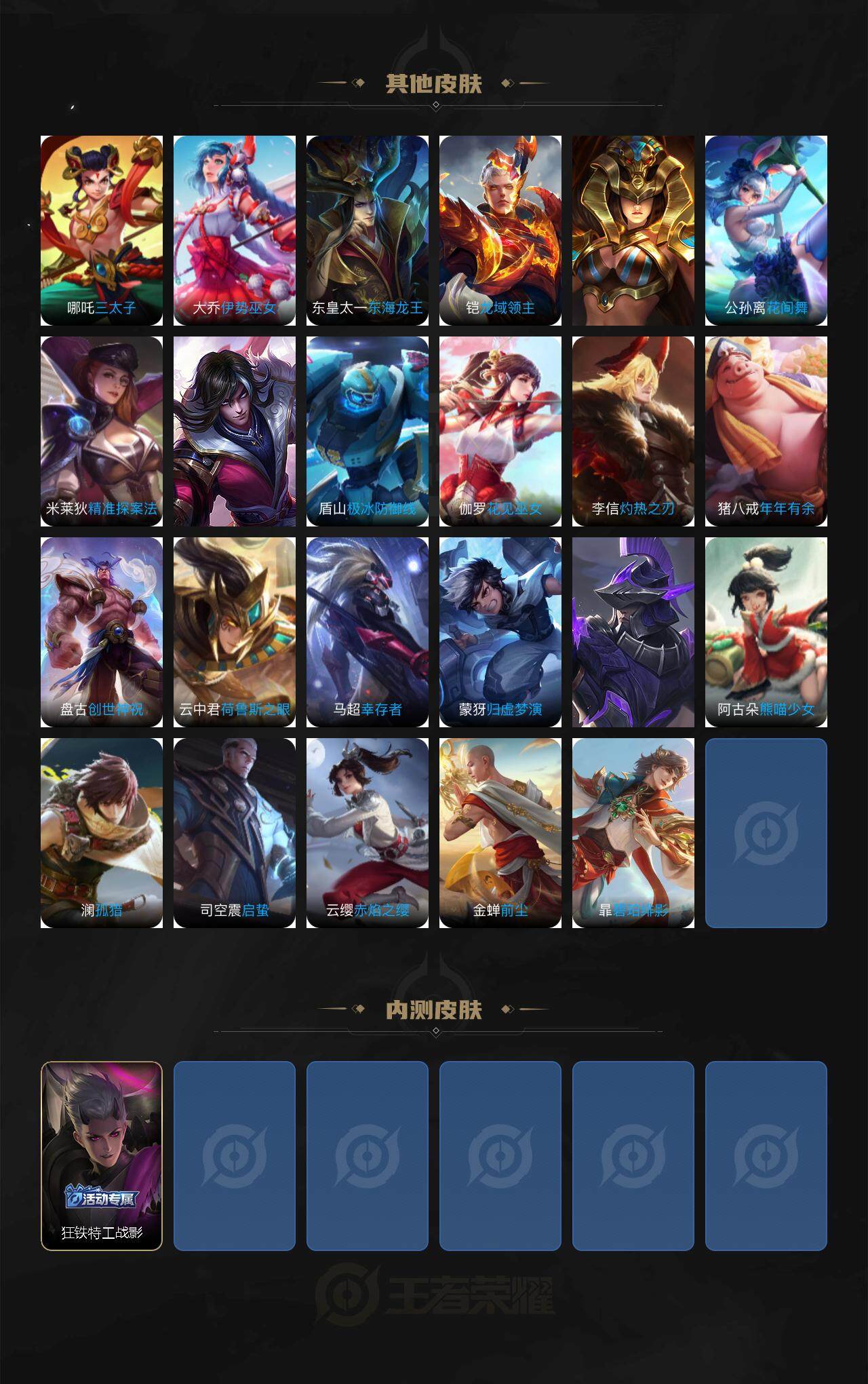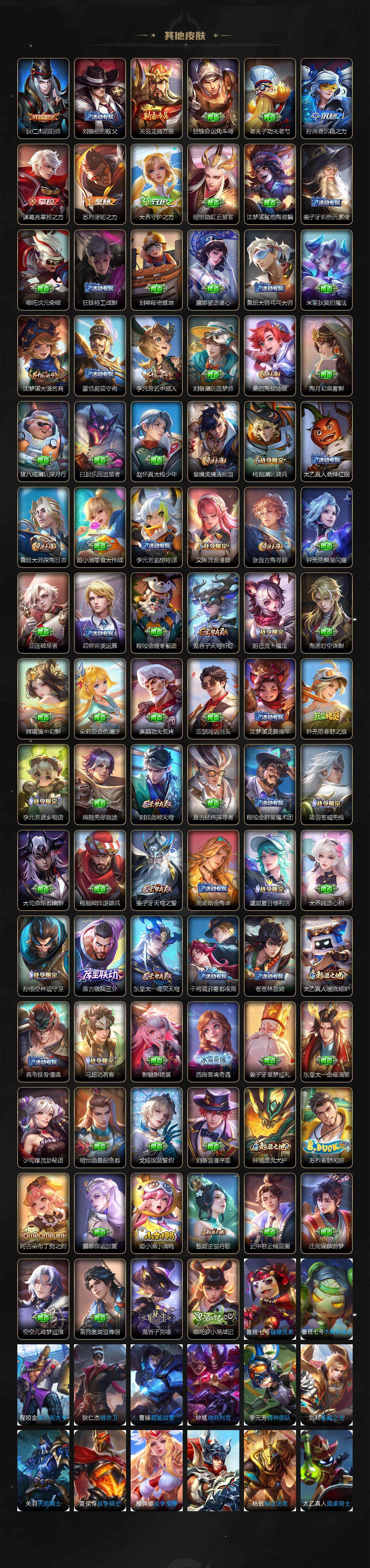 李元芳逐浪之夏,不知火舞魅语,公孙离无限星赏官,阿轲节奏热浪,露娜紫霞仙子,诸葛亮黄金分割率,项羽苍穹之光,雅典娜冰冠公主,吕布末日机甲,橘右京修罗,墨子龙骑士,嬴政摇滚巨星,刘禅绅士熊喵,白起星夜王子,安琪拉心灵骇客,程咬金功夫厨神,刘邦德古拉伯爵,兰陵王暗隐猎兽者,曹操幽灵船长,宫本武藏鬼剑武藏,亚瑟心灵战警,蔡文姬舞动绿茵,廉颇地狱岩魂,小乔缤纷独角兽,夏侯惇乘风破浪,花木兰水晶猎龙者,墨子金属风暴,百里玄策原初追逐者,貂蝉圣诞恋歌,百里守约特工魅影,嬴政暗夜贵公子,嫦娥拒霜思,蒙犽百解令,周瑜雪夜绮愿,高渐离燃音魔法,伽罗琥珀纪元,白起苍鳞隐世,赵怀真器灵·浮梦炉