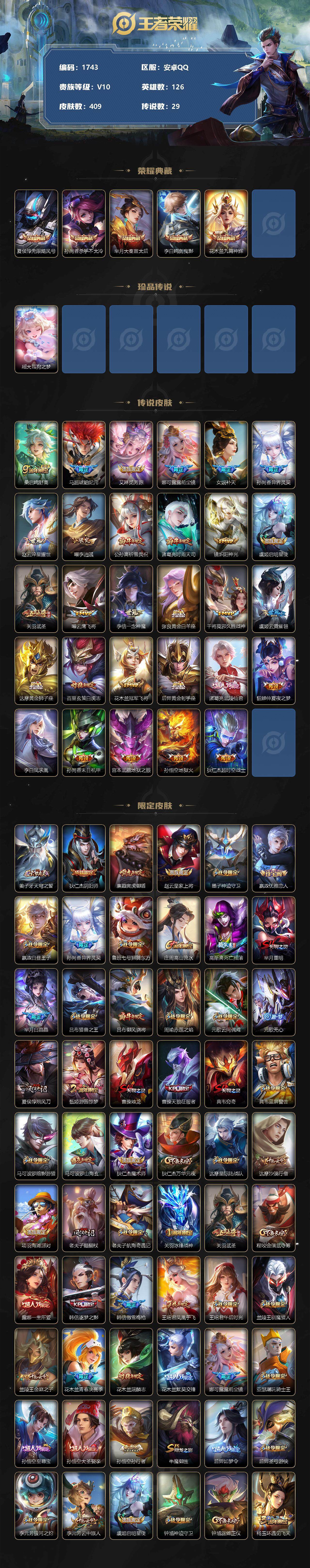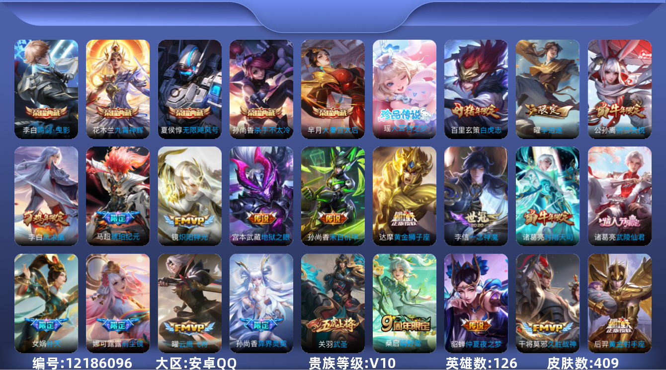 [12186096]【商品标题】:安卓Q-V10-至尊星耀IV段位-126英雄-409皮肤-5典藏-0珍品无双-0无双-1珍品传说-29传说-125史诗