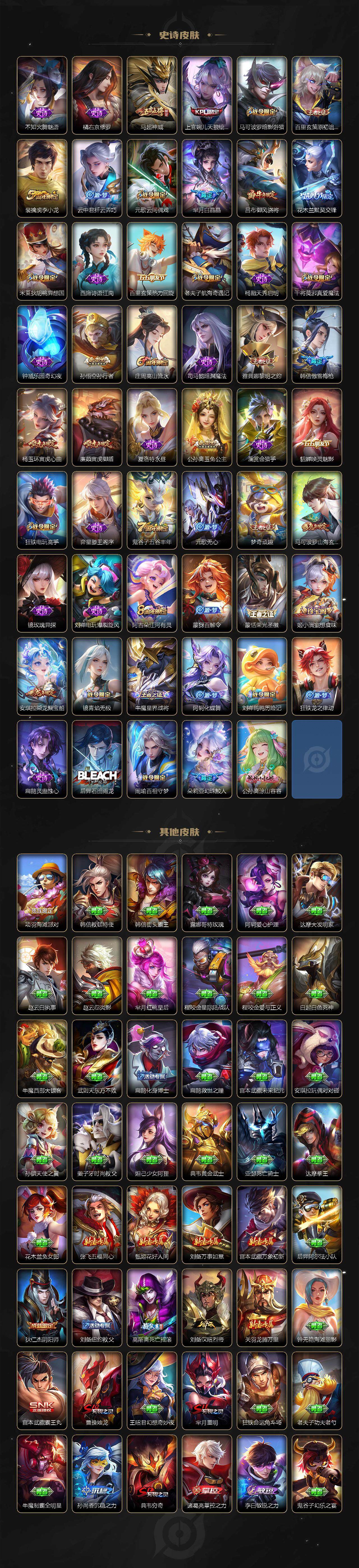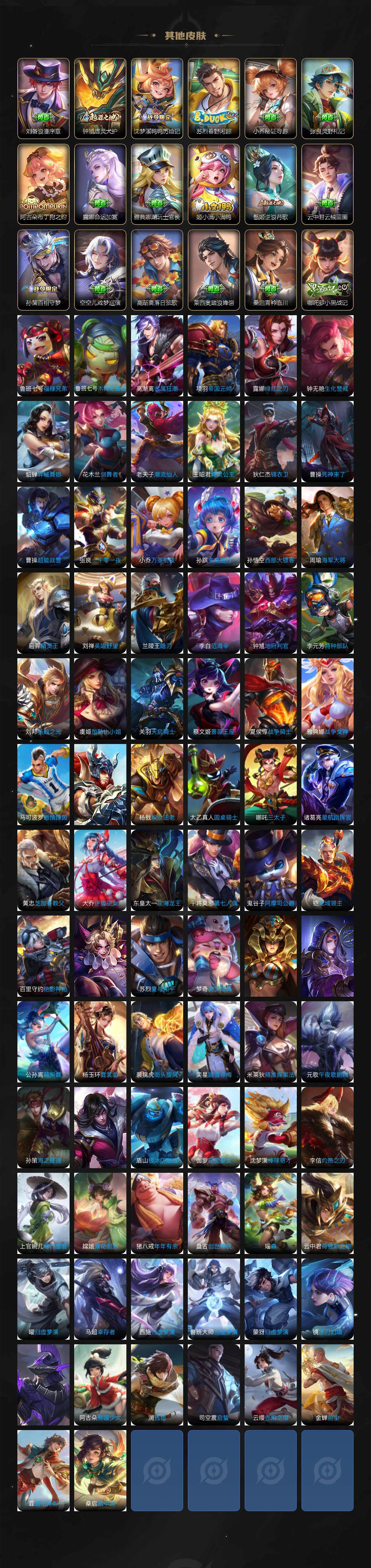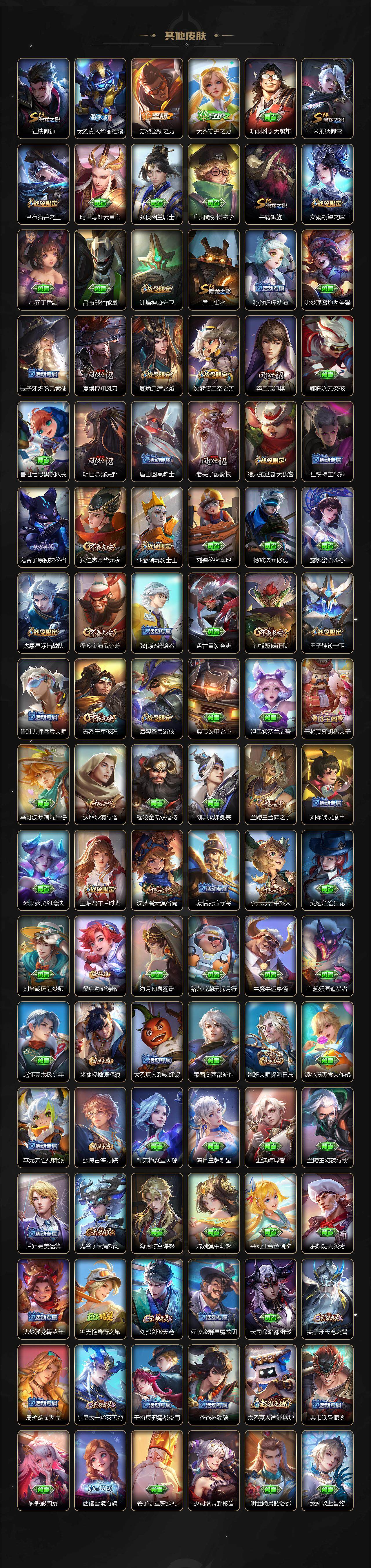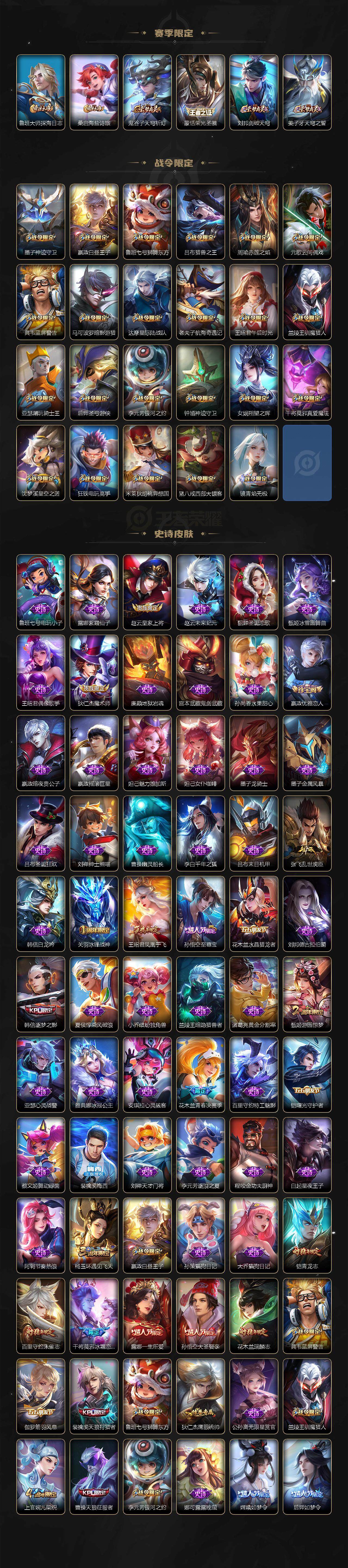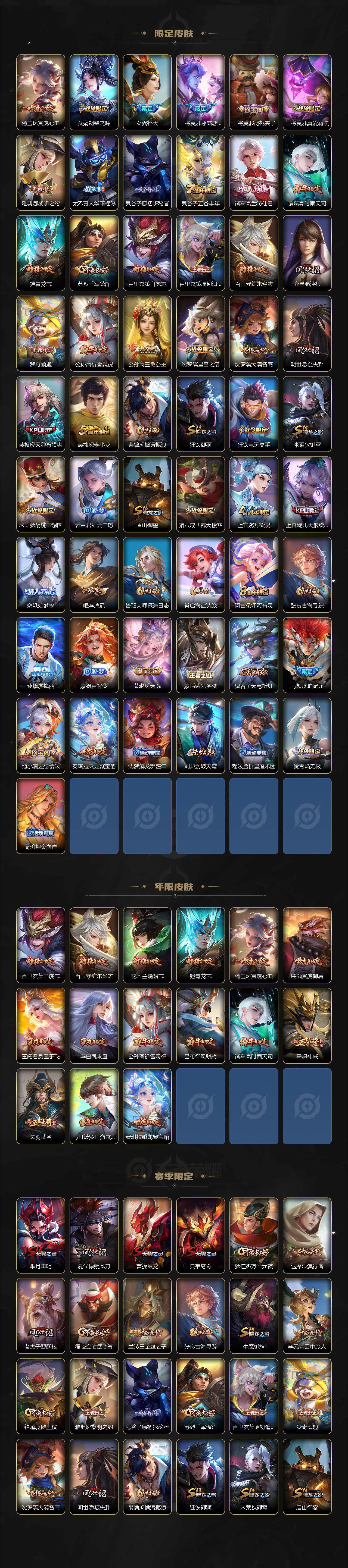 【限定皮肤】:姜子牙天穹之誓,狄仁杰阴阳师,廉颇寅虎御盾,赵云皇家上将,墨子神迹守卫,嬴政优雅恋人,嬴政白昼王子,孙尚香异界灵契,鲁班七号狮舞东方,庄周高山流水,高渐离死亡摇滚,芈月重明,芈月白晶晶,吕布猎兽之王,吕布御风骁将,周瑜赤莲之焰,元歌云间偶戏,元歌无心,夏侯惇朔风刀,甄姬游园惊梦,曹操烛龙,曹操天狼征服者,典韦穷奇,典韦蓝屏警告,马可波罗暗影游猎,马可波罗山海玄木吟,狄仁杰魔术师,狄仁杰万华元夜,达摩星际陆战队,达摩沙漠行僧,项羽海滩派对,老夫子醍醐杖,老夫子航海奇遇记,关羽冰锋战神,关羽武圣,程咬金演武夺筹,露娜一生所爱,韩信逐梦之影,韩信傲雪梅枪,王昭君凤凰于飞,王昭君午后时光,兰陵王驯魔猎人,兰陵王金庭之子,花木兰青春决赛季,花木兰瑞麟志,花木兰默契交锋,娜可露露前尘镜,亚瑟潮玩骑士王,孙悟空至尊宝,孙悟空大圣娶亲,孙悟空孙行者,牛魔御旌,后羿如梦令,后羿圣弓游侠,李元芳银河之约,李元芳云中旅人,虞姬启明星使,钟馗神迹守卫,钟馗驱傩正仪,杨玉环遇见飞天,杨玉环寅虎心曲,女娲朔望之晖,女娲补天,干将莫邪冰霜恋舞曲,干将莫邪胡桃夹子,干将莫邪真爱魔法,雅典娜黎明之约,太乙真人华丽摇滚,鬼谷子原初探秘者,鬼谷子五谷丰年,诸葛亮武陵仙君,诸葛亮时雨天司,铠青龙志,苏烈千军破阵,百里玄策白虎志,百里玄策原初追逐者,百里守约朱雀志,弈星混沌棋,梦奇顽趣,公孙离祈雪灵祝,公孙离玉兔公主,沈梦溪星空之诺,沈梦溪大漠名商,明世隐疑决卦,裴擒虎天狼狩猎者,裴擒虎李小龙,裴擒虎擒涛扼浪,