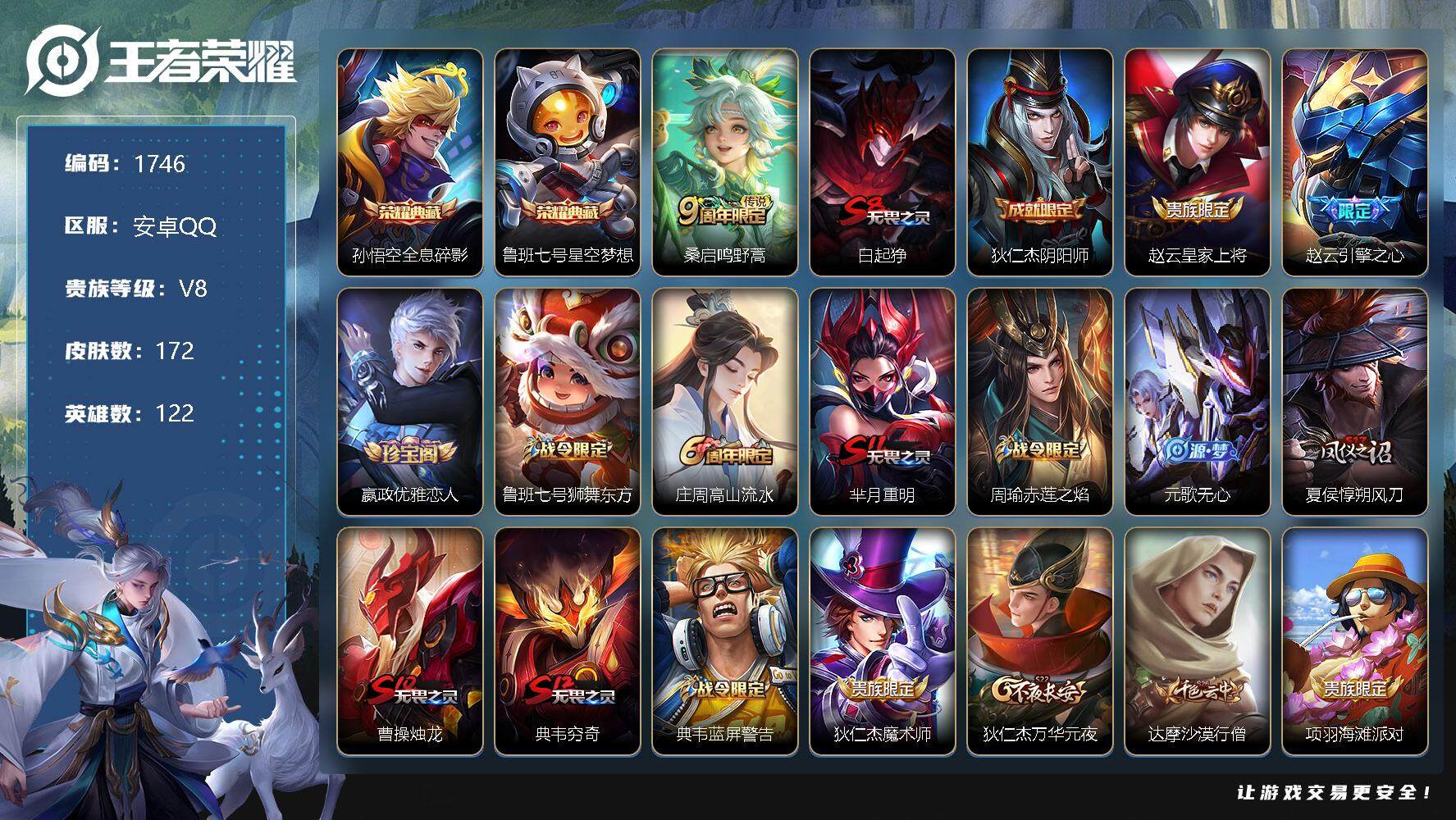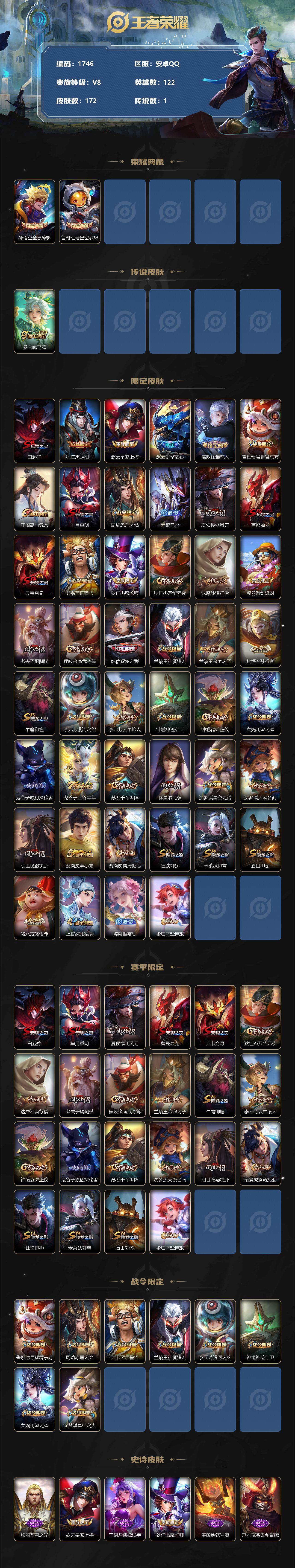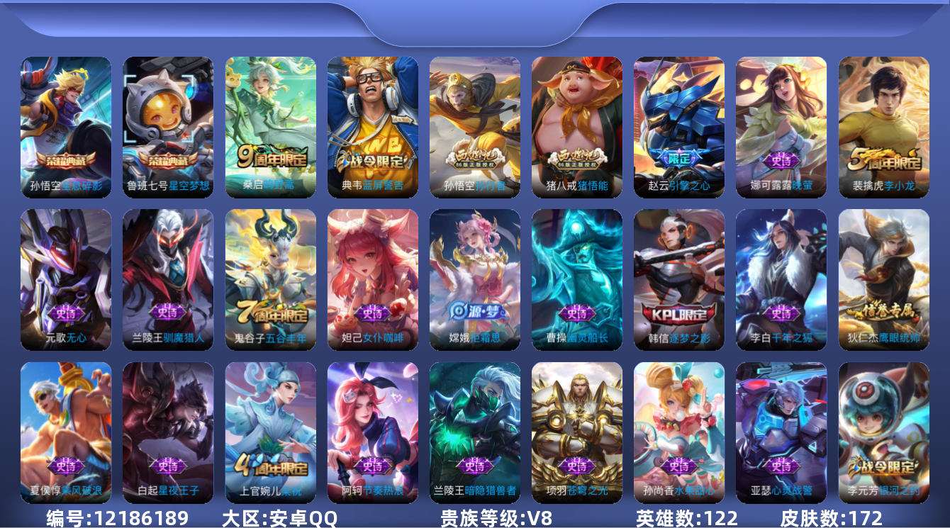 [12186189]【商品标题】:安卓Q-V6-永恒钻石V段位-122英雄-172皮肤-2典藏-0珍品无双-0无双-0珍品传说-1传说-40史诗