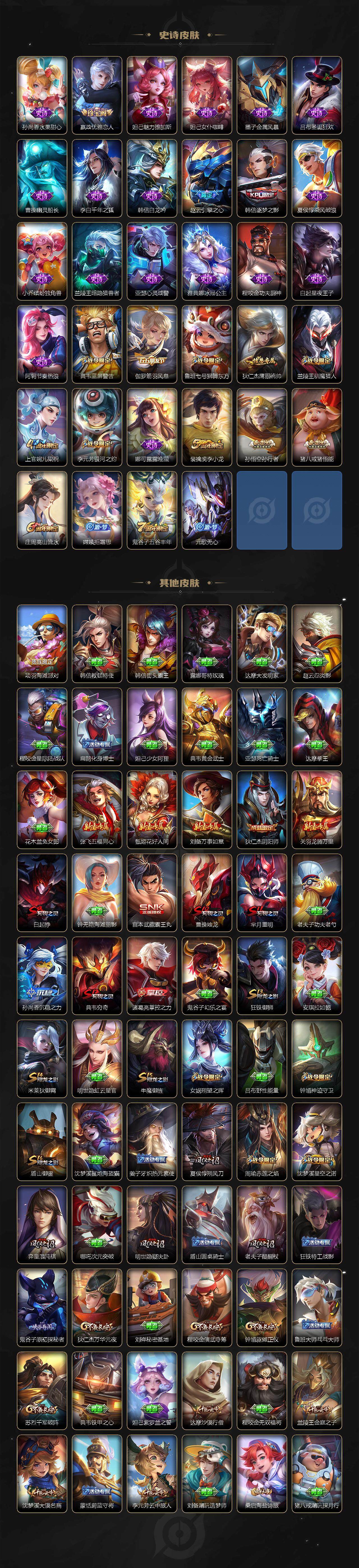 【史诗皮肤】:项羽苍穹之光,赵云皇家上将,王昭君偶像歌手,狄仁杰魔术师,廉颇地狱岩魂,宫本武藏鬼剑武藏,孙尚香水果甜心,嬴政优雅恋人,妲己魅力维加斯,妲己女仆咖啡,墨子金属风暴,吕布圣诞狂欢,曹操幽灵船长,李白千年之狐,韩信白龙吟,赵云引擎之心,韩信逐梦之影,夏侯惇乘风破浪,小乔缤纷独角兽,兰陵王暗隐猎兽者,亚瑟心灵战警,雅典娜冰冠公主,程咬金功夫厨神,白起星夜王子,阿轲节奏热浪,典韦蓝屏警告,伽罗箭羽风息,鲁班七号狮舞东方,狄仁杰鹰眼统帅,兰陵王驯魔猎人,上官婉儿梁祝,李元芳银河之约,娜可露露晚萤,裴擒虎李小龙,孙悟空孙行者,猪八戒猪悟能,庄周高山流水,嫦娥拒霜思,鬼谷子五谷丰年,元歌无心