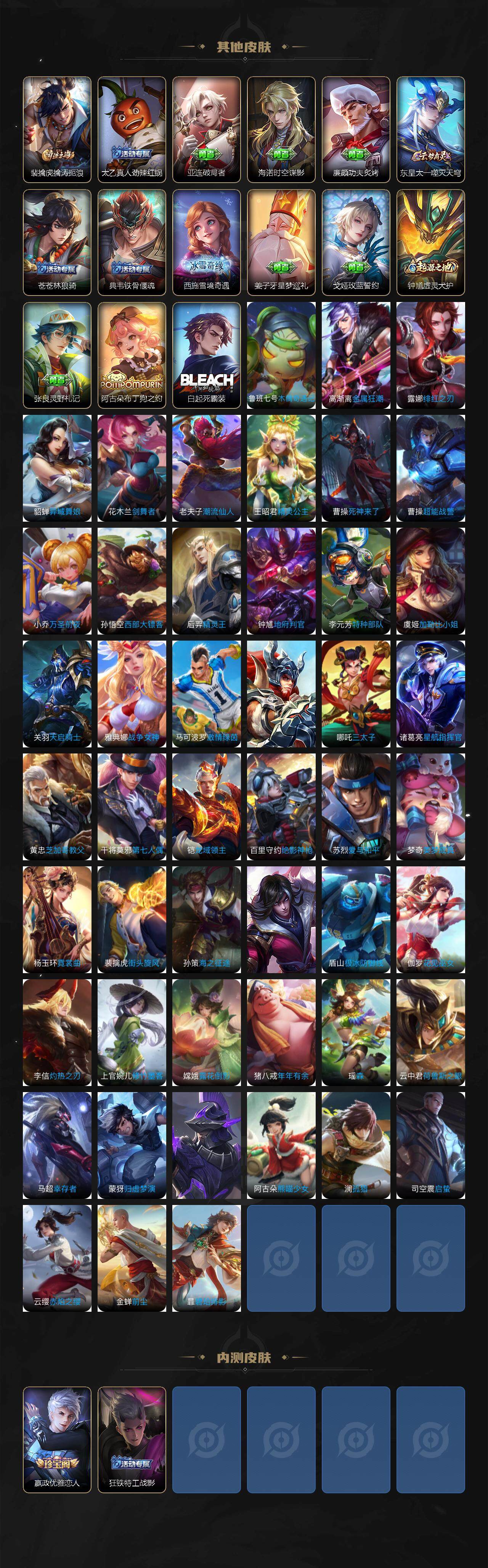 【限定皮肤】:白起狰,狄仁杰阴阳师,赵云皇家上将,赵云引擎之心,嬴政优雅恋人,鲁班七号狮舞东方,庄周高山流水,芈月重明,周瑜赤莲之焰,元歌无心,夏侯惇朔风刀,曹操烛龙,典韦穷奇,典韦蓝屏警告,狄仁杰魔术师,狄仁杰万华元夜,达摩沙漠行僧,项羽海滩派对,老夫子醍醐杖,程咬金演武夺筹,韩信逐梦之影,兰陵王驯魔猎人,兰陵王金庭之子,孙悟空孙行者,牛魔御旌,李元芳银河之约,李元芳云中旅人,钟馗神迹守卫,钟馗驱傩正仪,女娲朔望之晖,鬼谷子原初探秘者,鬼谷子五谷丰年,苏烈千军破阵,弈星混沌棋,沈梦溪星空之诺,沈梦溪大漠名商,明世隐疑决卦,裴擒虎李小龙,裴擒虎擒涛扼浪,狂铁御狮,米莱狄御霄,盾山御銮,猪八戒猪悟能,上官婉儿梁祝,嫦娥拒霜思,桑启海盐诗旅