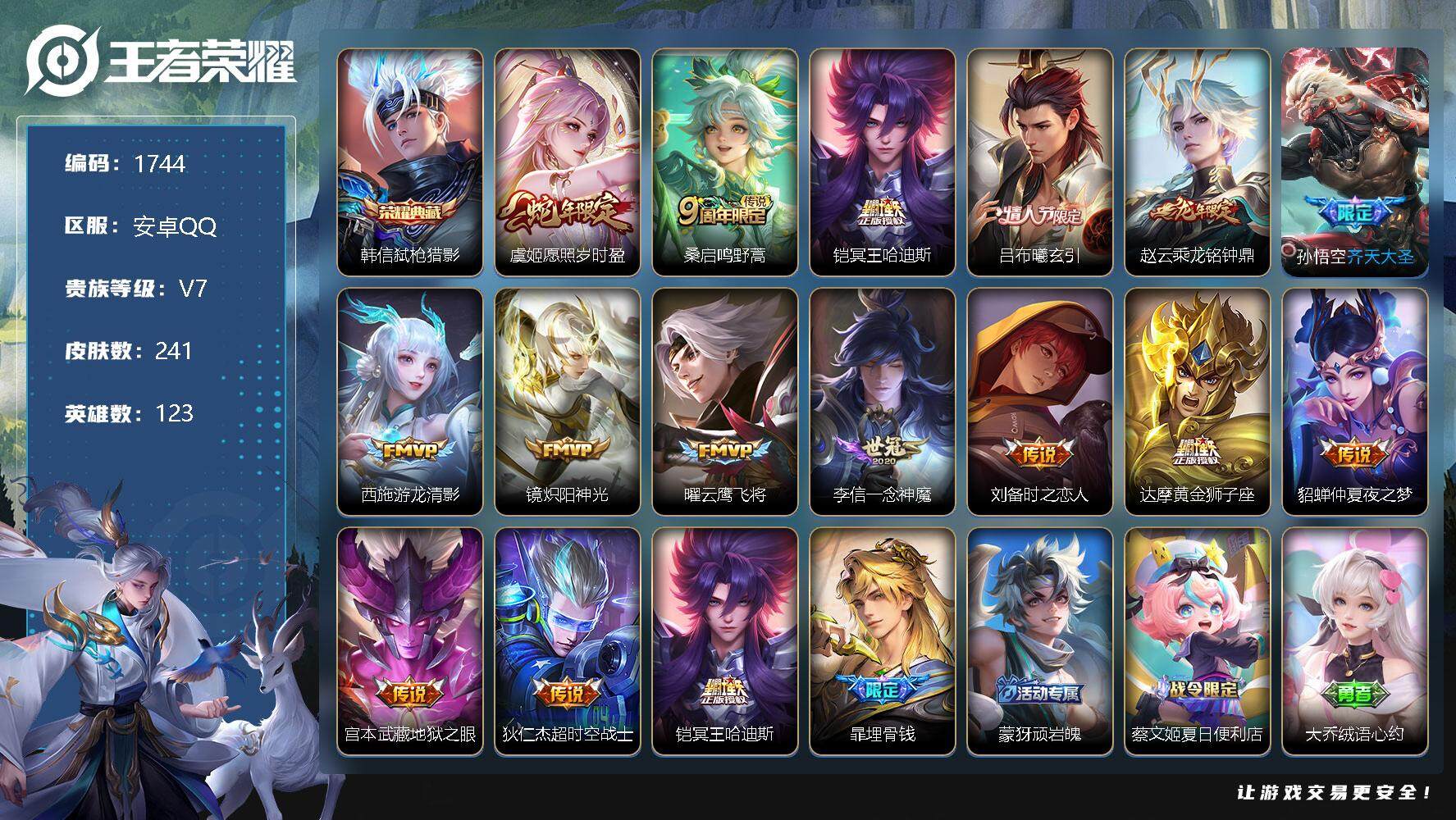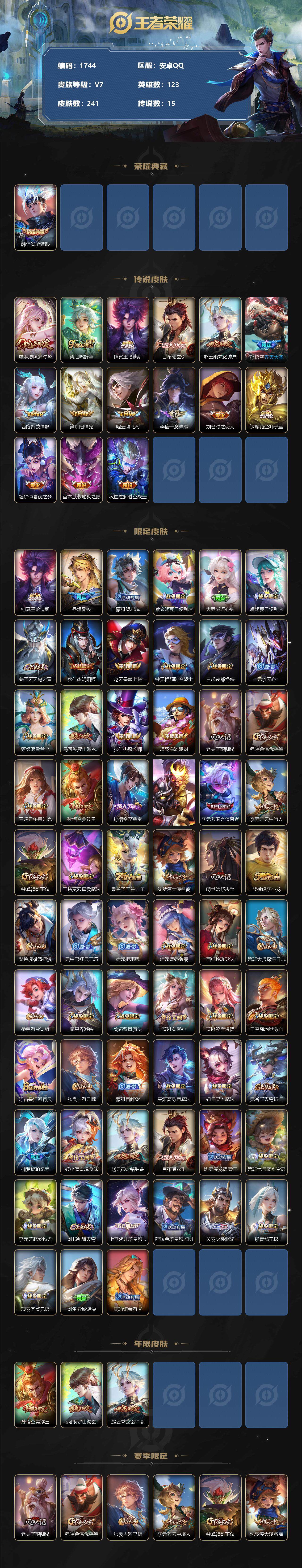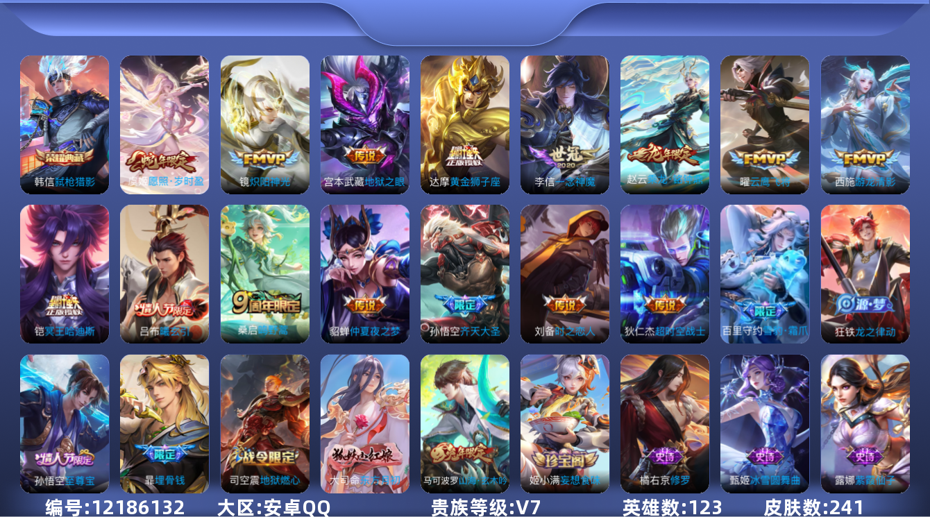 [12186132]【商品标题】:安卓Q-V4-至尊星耀V段位-123英雄-241皮肤-1典藏-0珍品无双-0无双-0珍品传说-15传说-68史诗