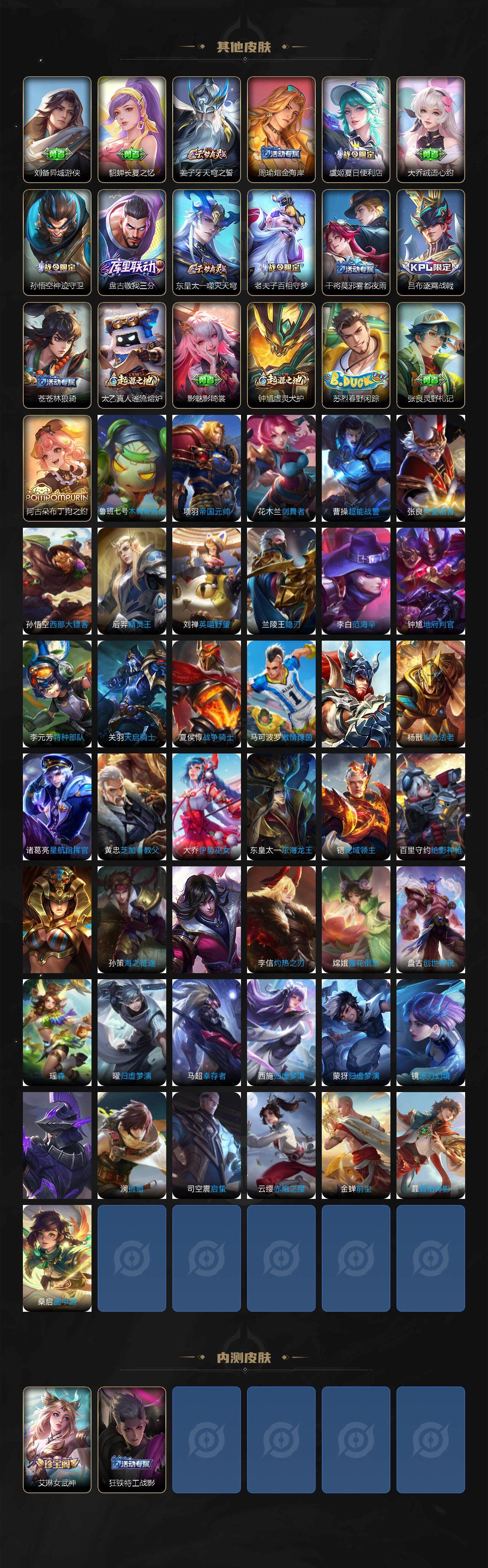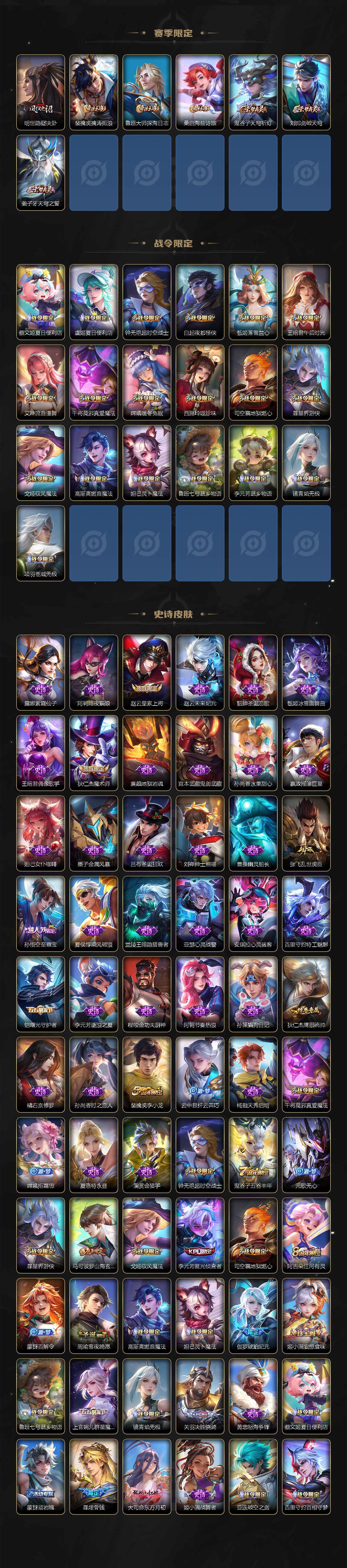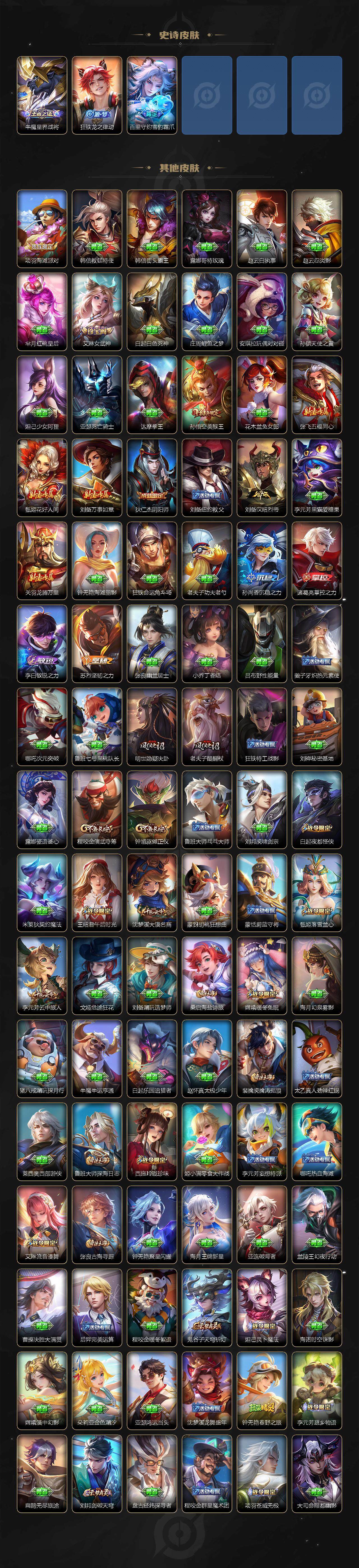 【限定皮肤】:铠冥王哈迪斯,暃埋骨钱,蒙犽顽岩魄,蔡文姬夏日便利店,大乔绒语心约,虞姬夏日便利店,姜子牙天穹之誓,狄仁杰阴阳师,赵云皇家上将,钟无艳超时空战士,白起夜都怪侠,元歌无心,甄姬落雪兰心,马可波罗山海玄木吟,狄仁杰魔术师,项羽海滩派对,老夫子醍醐杖,程咬金演武夺筹,王昭君午后时光,孙悟空美猴王,孙悟空至尊宝,孙悟空齐天大圣,李元芳匿光侦查者,李元芳云中旅人,钟馗驱傩正仪,干将莫邪真爱魔法,鬼谷子五谷丰年,沈梦溪大漠名商,明世隐疑决卦,裴擒虎李小龙,裴擒虎擒涛扼浪,云中君纤云弄巧,嫦娥拒霜思,嫦娥暖冬兔眠,西施玲珑珍味,鲁班大师探海日志,桑启海盐诗旅,暃星界游侠,戈娅驭风魔法,艾琳女武神,艾琳流音漫舞,司空震地狱燃心,阿古朵江河有灵,张良古海寻踪,蒙犽百解令,高渐离燃音魔法,妲己灵卜魔法,鬼谷子天穹祈灯,伽罗琥珀纪元,姬小满妄想食味,赵云乘龙铭钟鼎,吕布曦玄引,沈梦溪龙舞盛年,鲁班七号蔬乡物语,李元芳蔬乡物语,刘邦剑破天穹,上官婉儿群星魔术团,程咬金群星魔术团,关羽决胜骁骑,镜青焰无极,项羽苍威无极,刘备异域游侠,周瑜熔金海岸