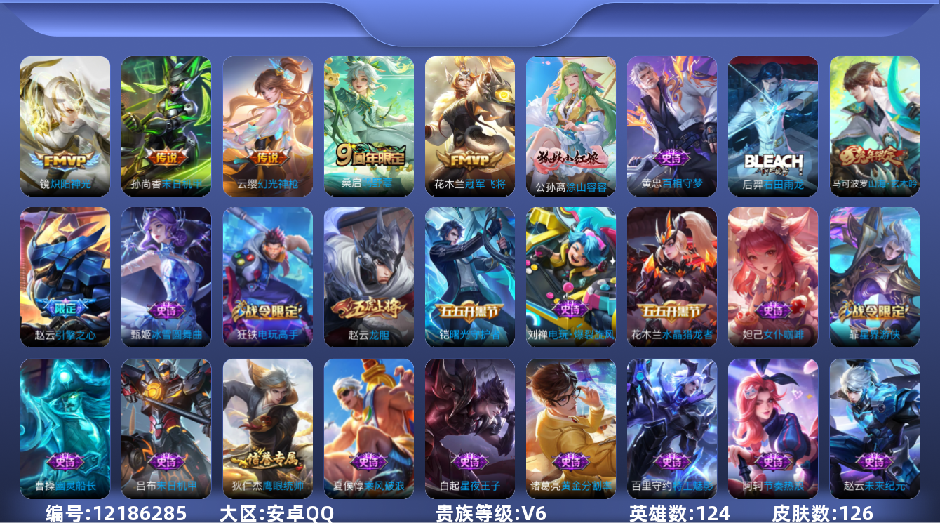 [12186285]【商品标题】:安卓Q-V5-至尊星耀III段位-124英雄-126皮肤-0典藏-0珍品无双-0无双-0珍品传说-5传说-38史诗