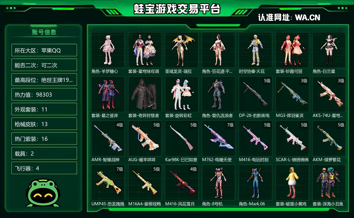 苹果QQ 可二次 当前段位荣耀皇冠Ⅳ 历史最高段位绝世王牌19星 热力值98303 等级68 套装180 王牌次数10 点券15 外观套装11 枪械皮肤13 热门紫装16 载具2 飞行器4 稀有0 头盔0 背包1